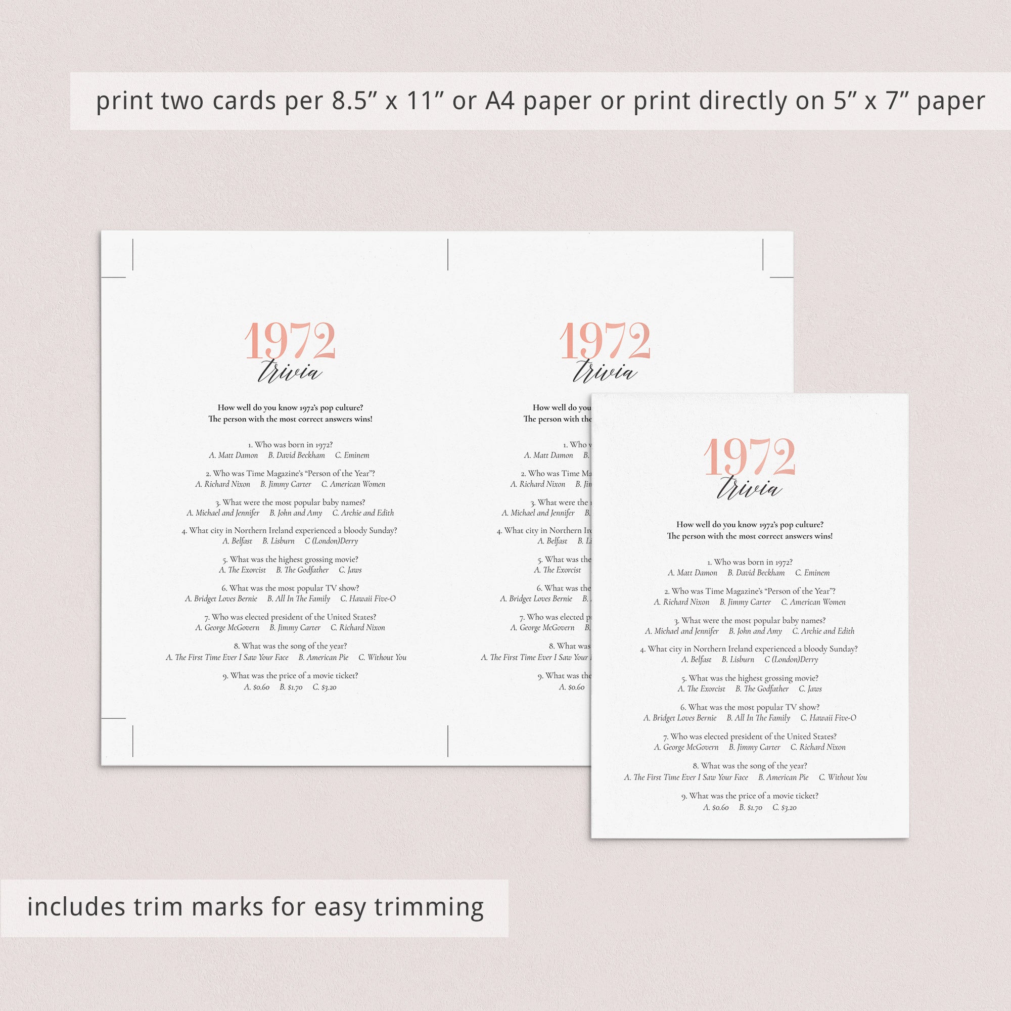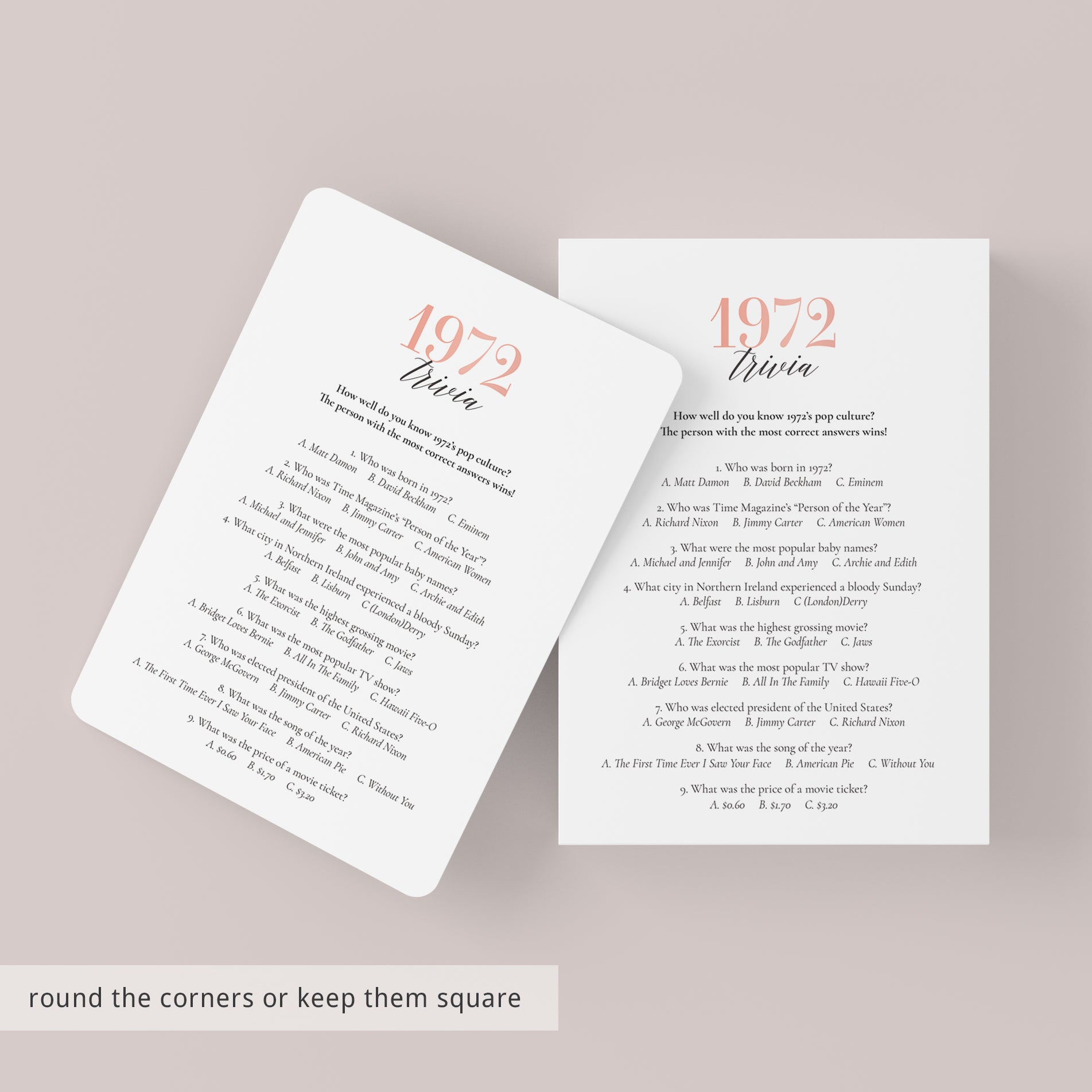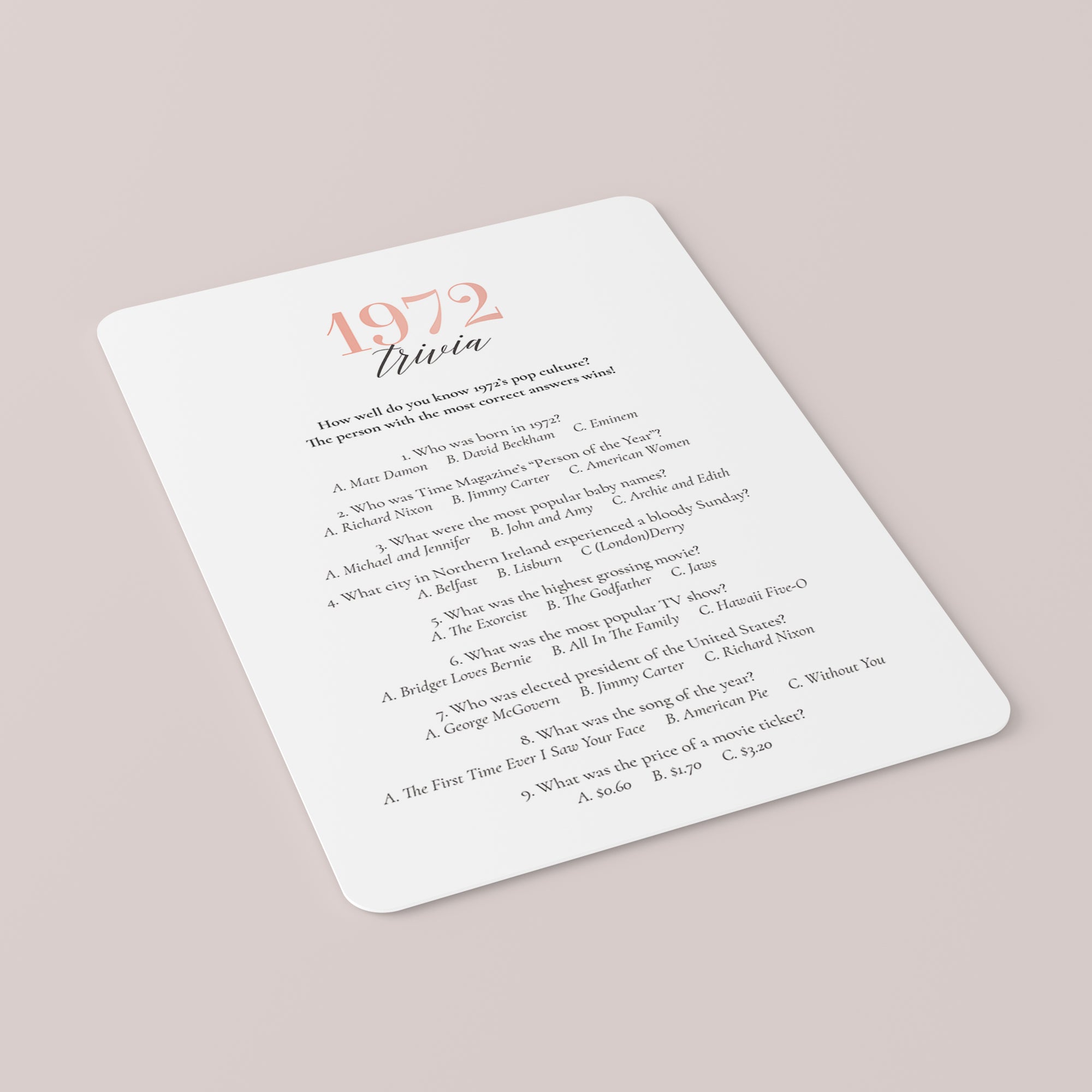 Are you looking for a fun game for a 53rd anniversary or 53rd birthday party? Look no further! This 1972 trivia game is such a fun game to play with your friends and family. Test your guests how well they know 1972's pop culture.