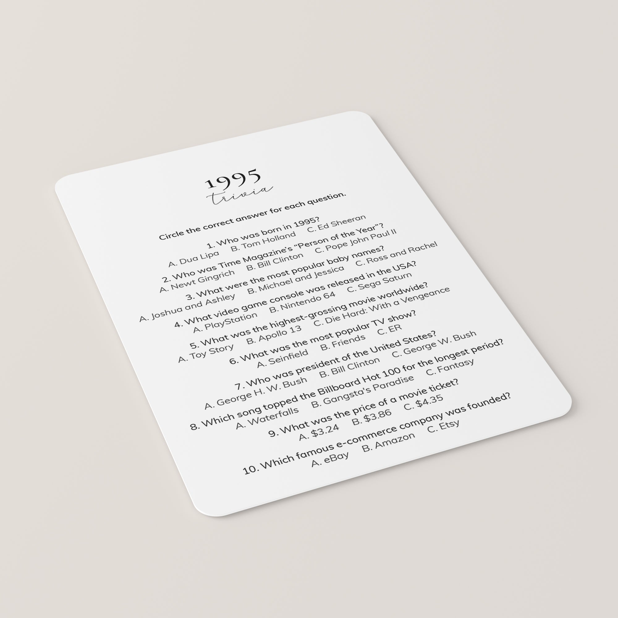 Are you looking for a fun quiz for a 30th birthday party or 30th anniversary? Look no further! This 1995 Quiz with 10 multiple choice questions is such a fun game to play with your friends and family. Test your guests how well they know 1995's pop culture. It's the perfect addition to a birthday bash for someone born in 1995 or to an anniversary party for a couple married in 1995.
