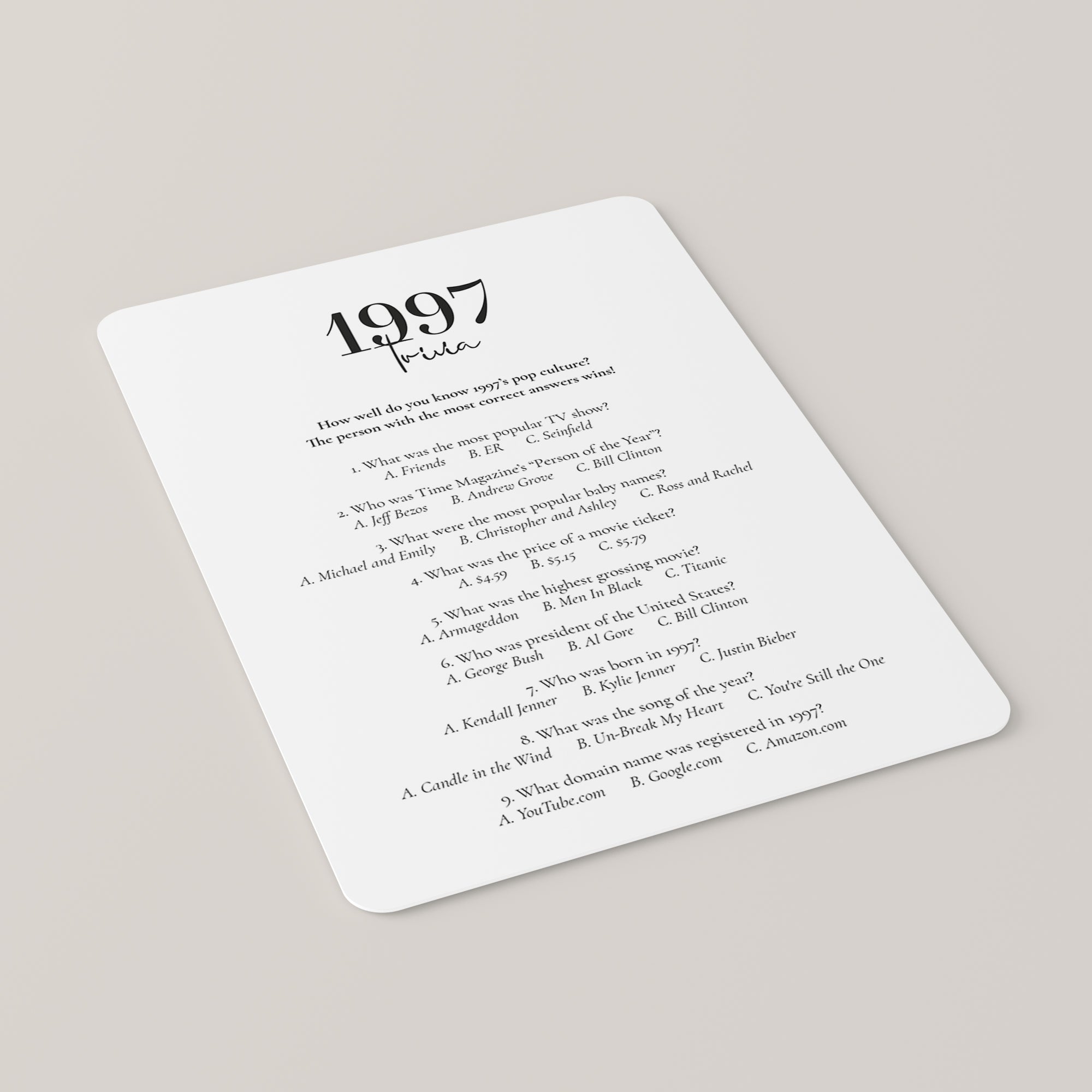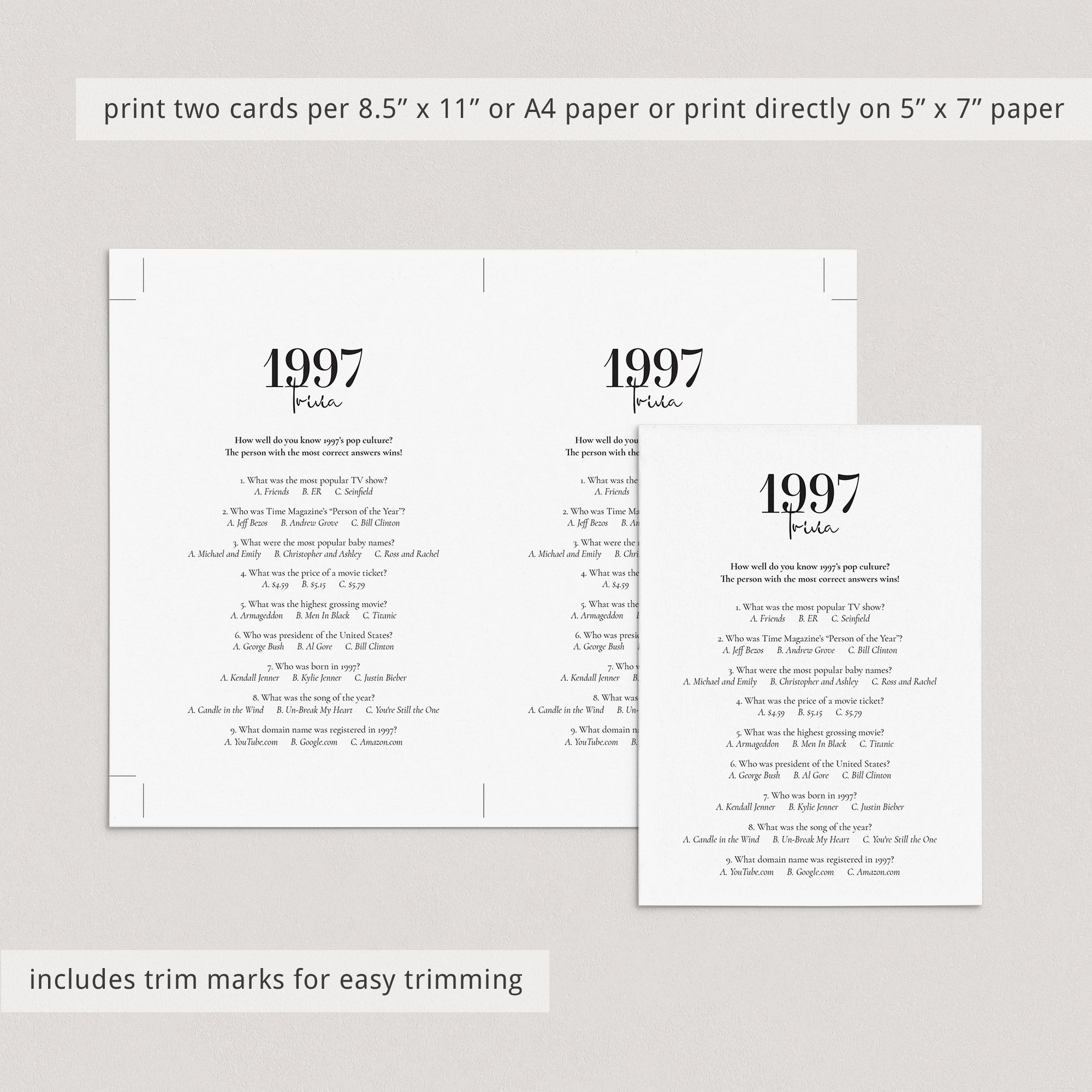 This printable 1997 quiz is an instant download. After purchase you will receive a download link immediately on screen. Also within minutes of your order and payment, an e-mail will be sent to you with a link for your download.
