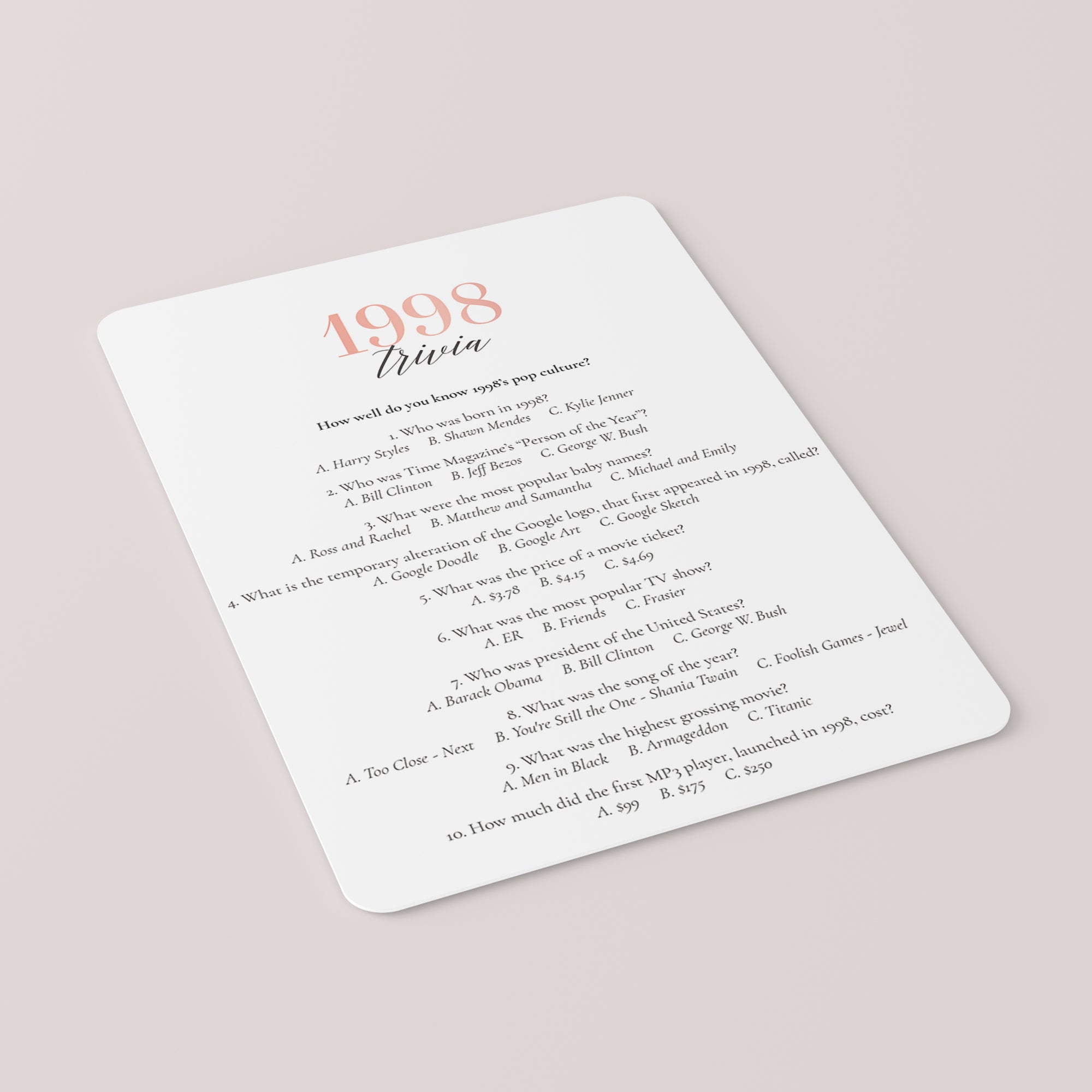 Are you looking for a fun game for a 27th birthday party? Look no further! This 1998 trivia quiz is such a fun game to play with your friends and family. Test your guests how well they know 1998's pop culture. It's the perfect addition to a birthday party for a woman born in 1998.