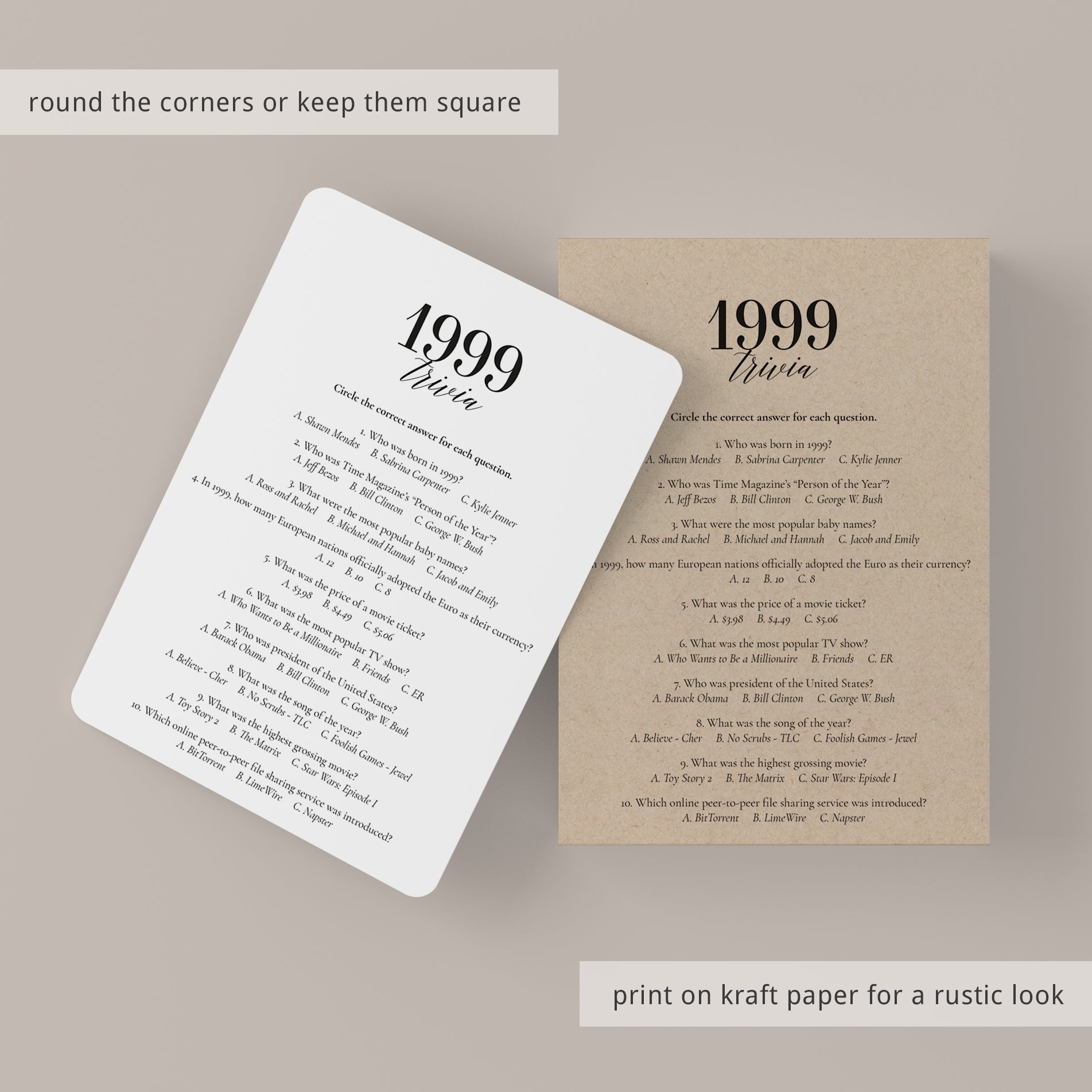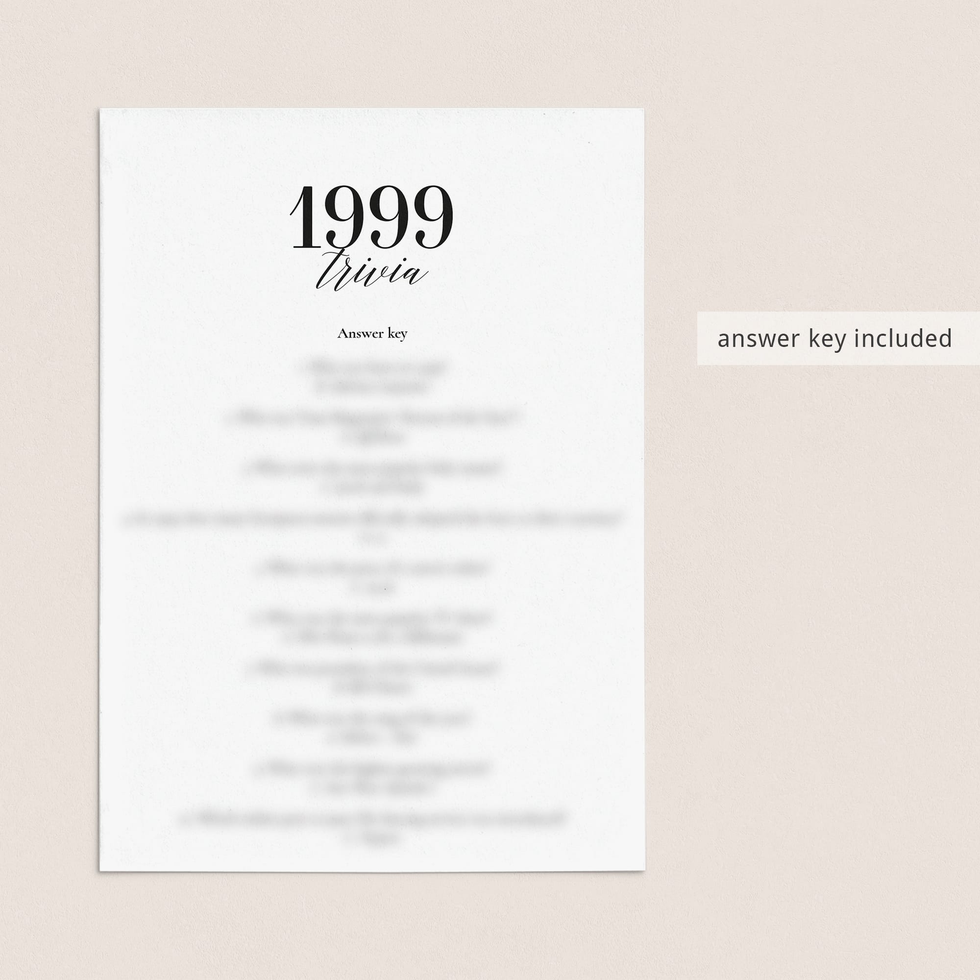 This fun facts about 1999 quiz is a digital download. After purchase you will receive a download link immediately on screen. Also within minutes of your order and payment, an e-mail will be sent to you with a link for your download.