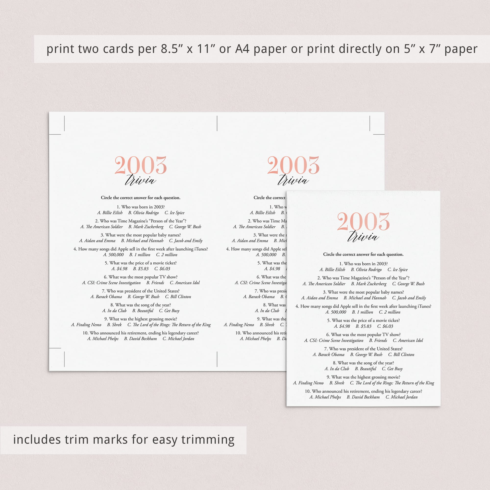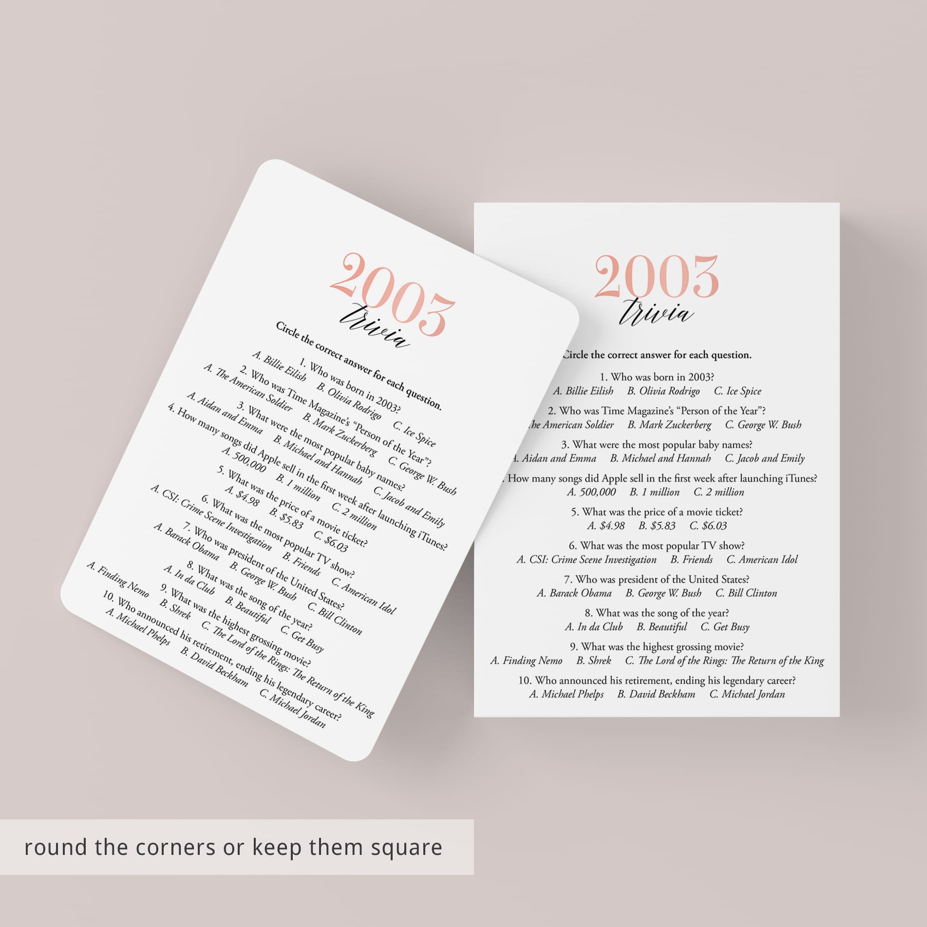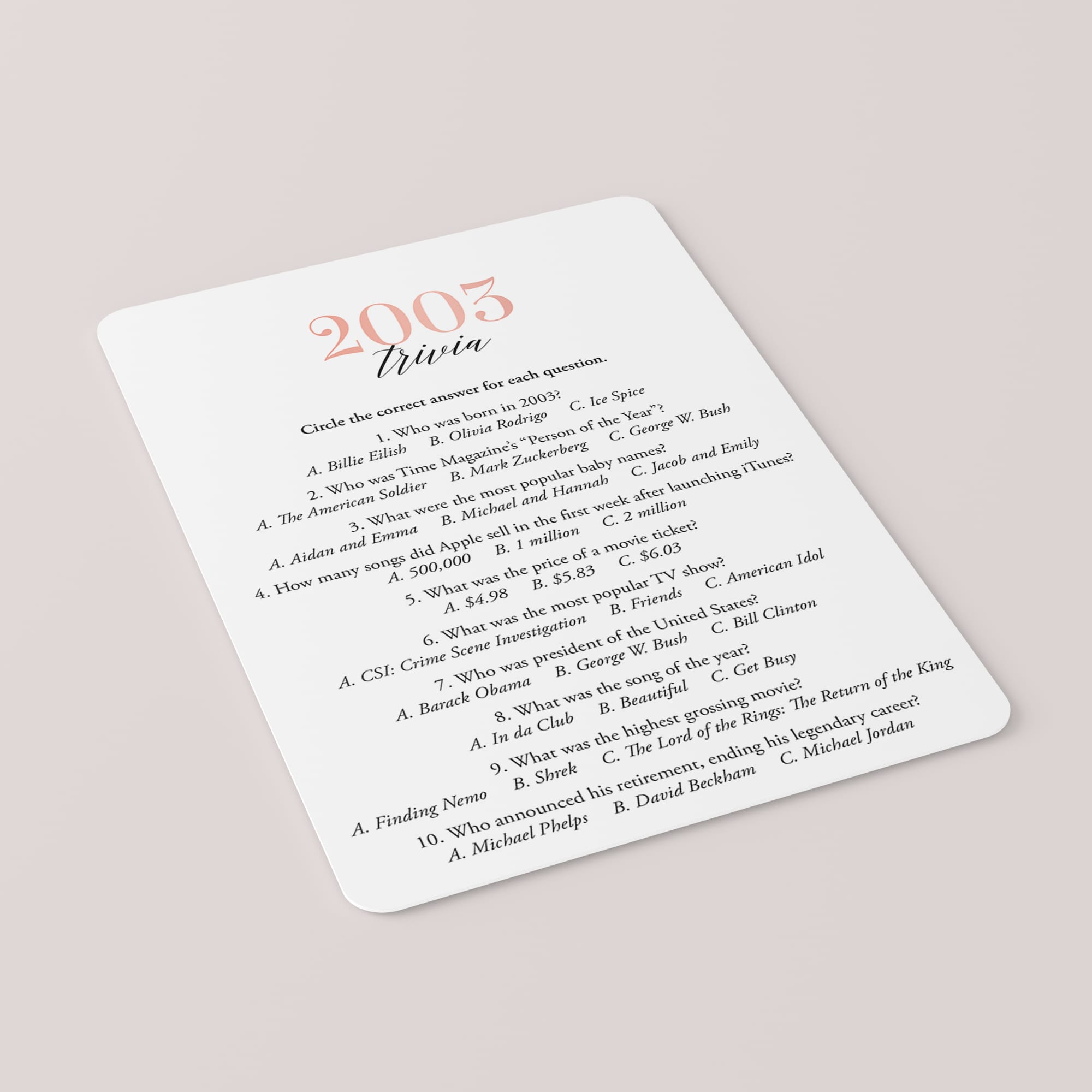 Are you looking for a fun game for a 22nd birthday party? Look no further! This 2003 trivia quiz with 10 multiple choice questions is such a fun game to play with your friends and family. Test your guests how well they know 2003's pop culture. It's the perfect addition to a birthday party for a woman born in 2003.