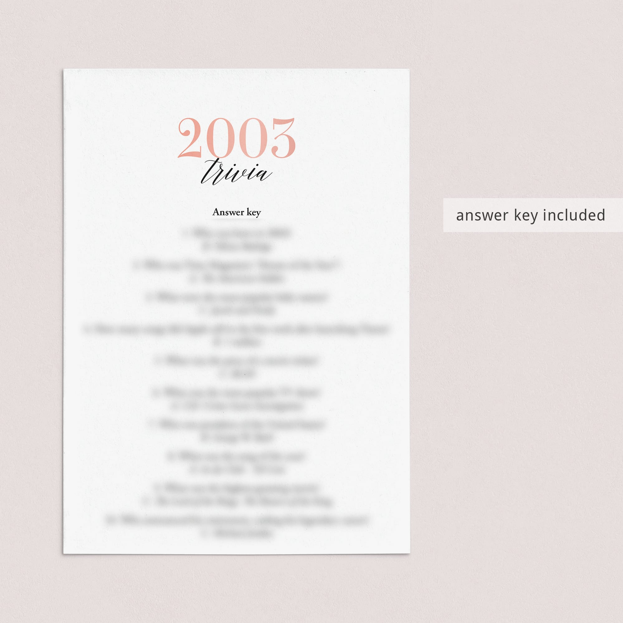 Just in case you are having trouble figuring out the answers, an answer key with the 2003 trivia answers is included.