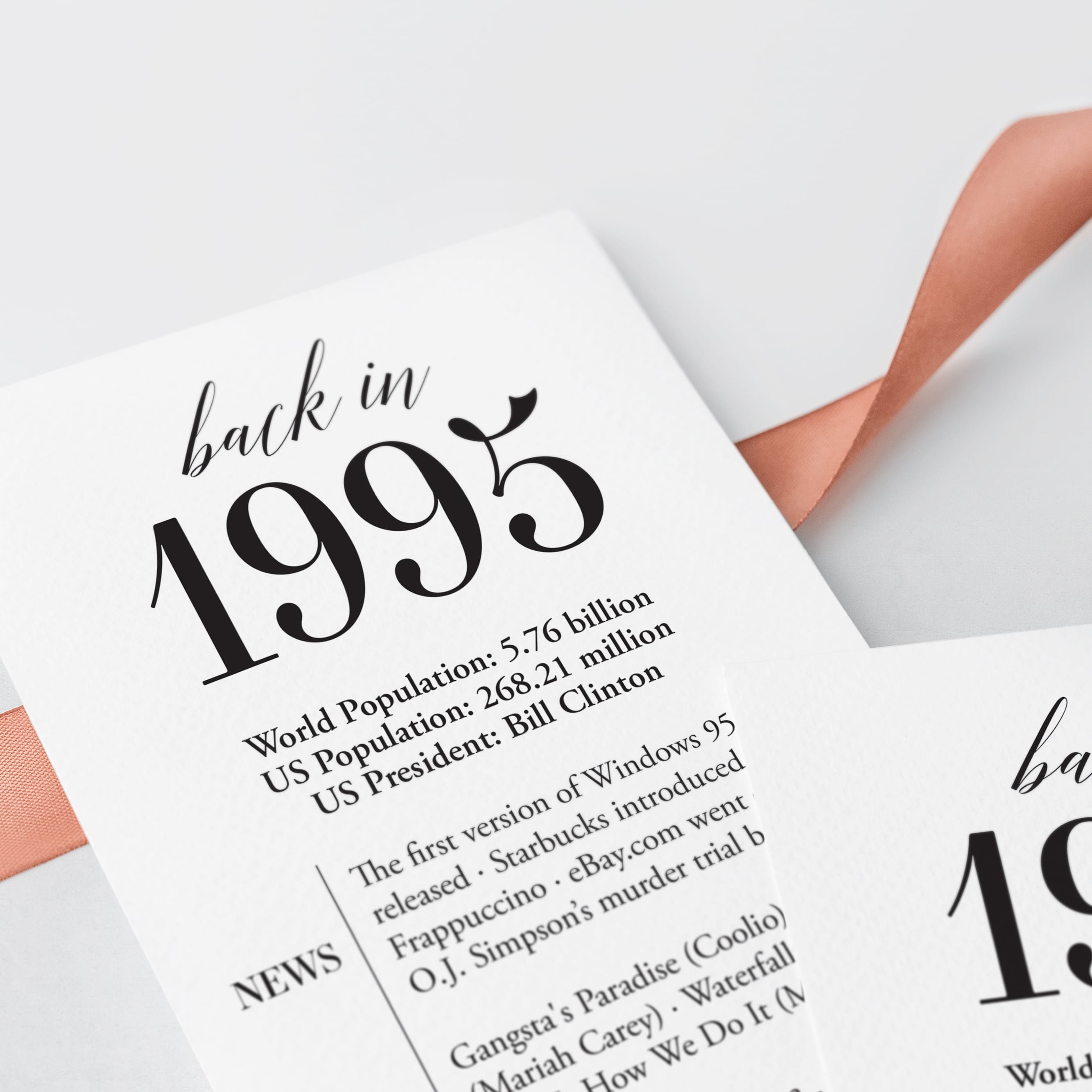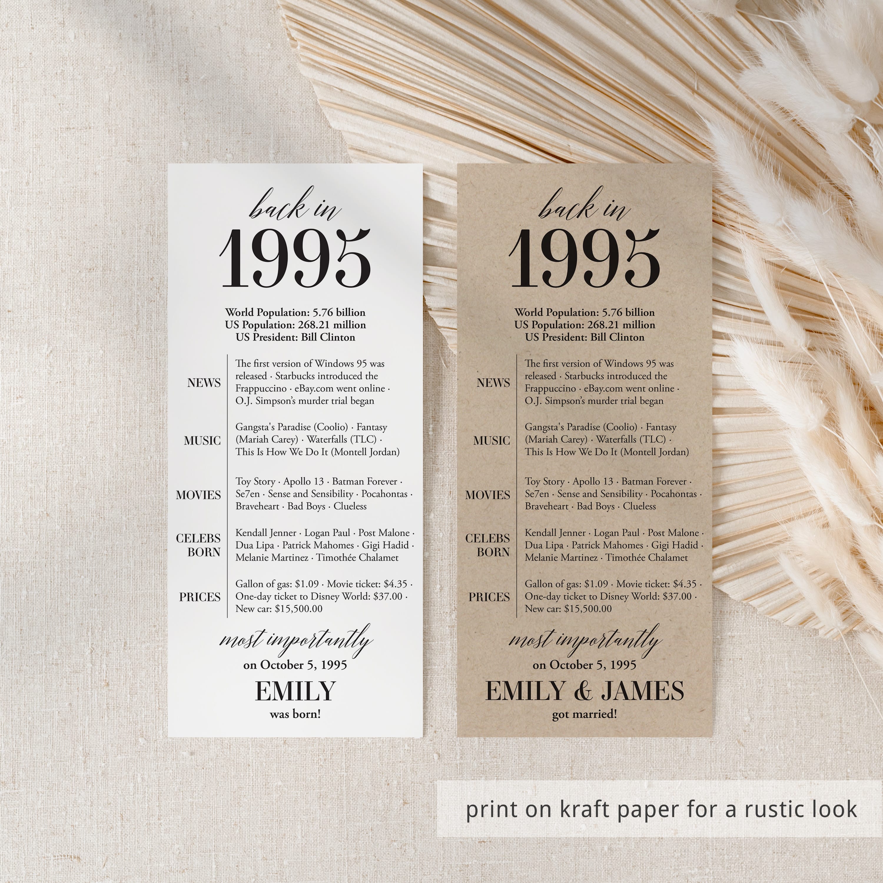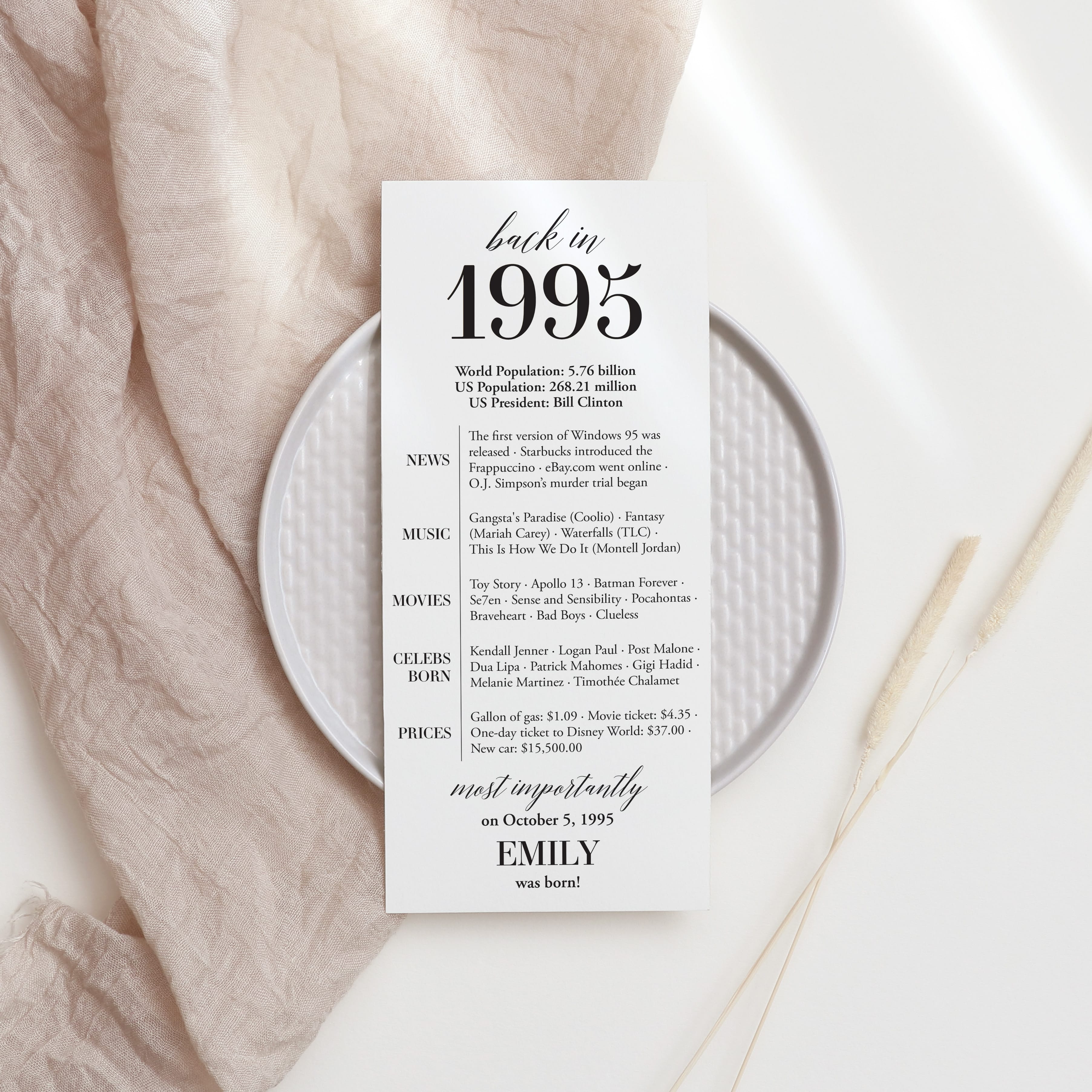 Are you looking for a simple yet elegant way to add a personal touch to a birthday celebration? Our “Back in 1995” table card is the perfect addition to any birthday party for someone turning 30 in 2025! This modern and minimalist card, personalized with the honoree’s name and birth date, showcases entertaining facts from 1995.