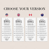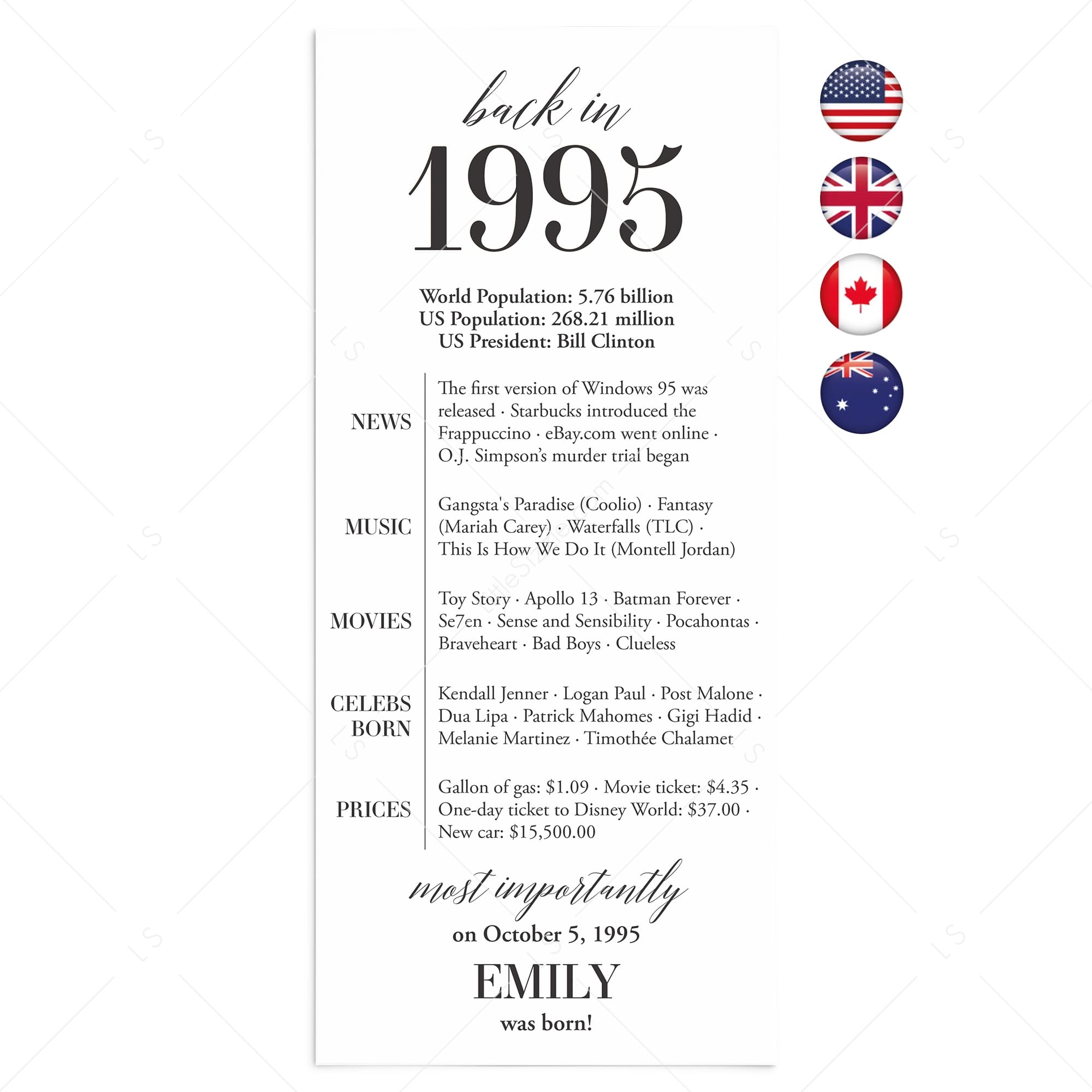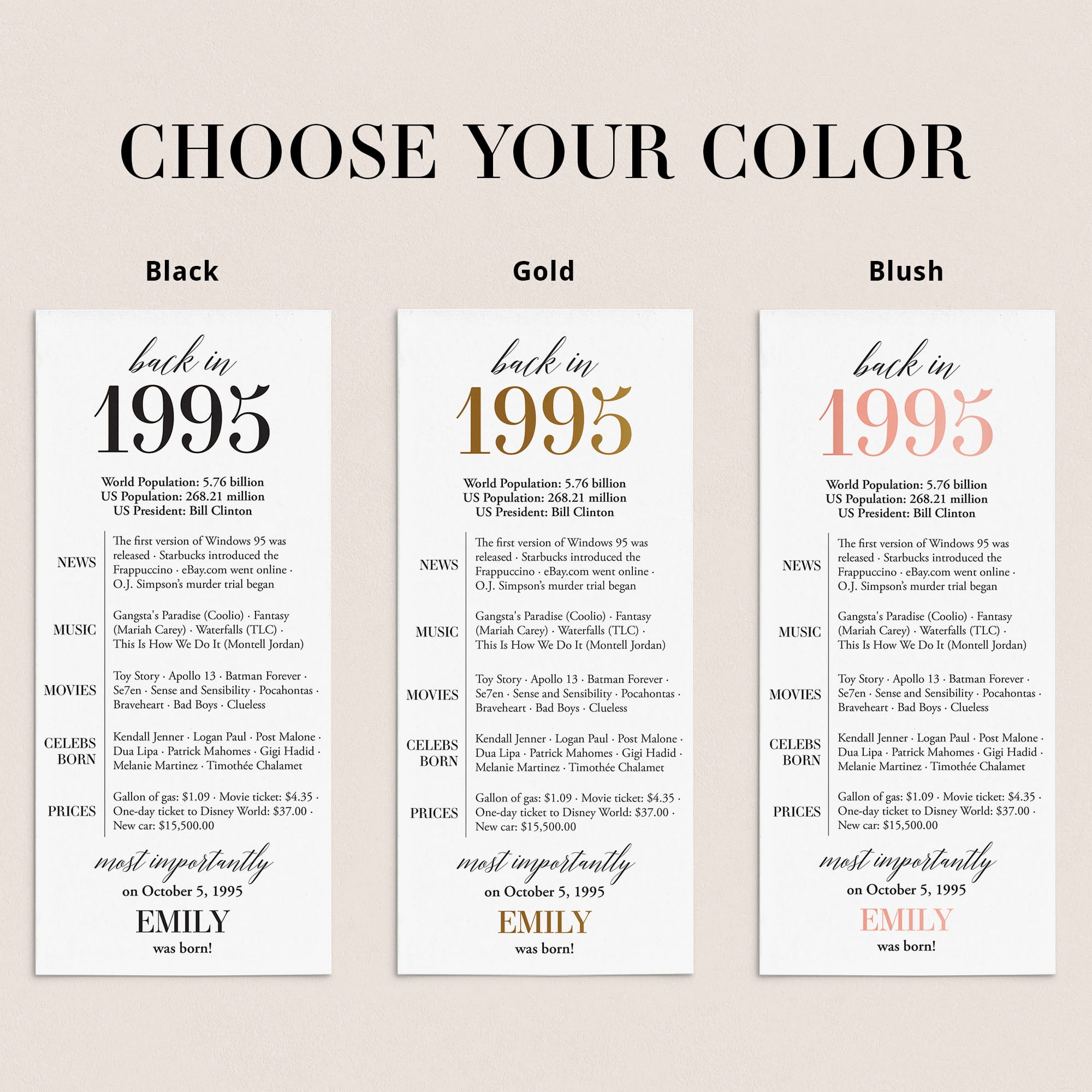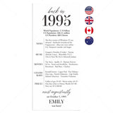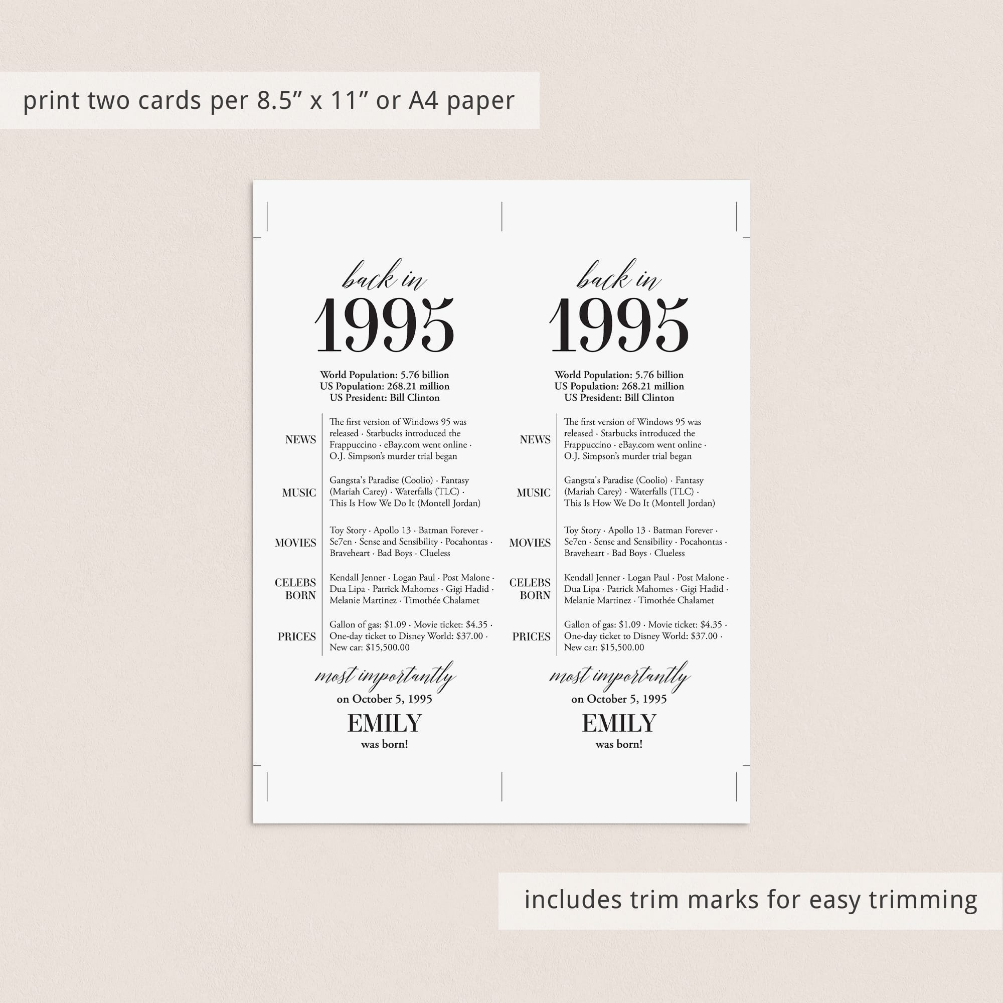 Are you looking for a simple yet elegant way to add a personal touch to a birthday celebration? Our “Back in 1995” table card is the perfect addition to any birthday party for someone turning 30 in 2025! This modern and minimalist card, personalized with the honoree’s name and birth date, showcases entertaining facts from 1995.