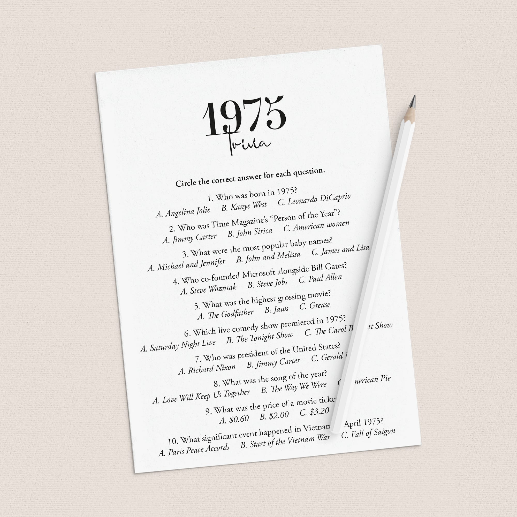 Celebrate a man’s 50th birthday in style with this 50th Birthday Games Bundle! This printable set, designed with a modern and minimalist aesthetic, includes 3 engaging and meaningful games and activities. From a nostalgic 1975s trivia game to heartfelt birthday wishes cards, this bundle adds the perfect touch to his milestone celebration.