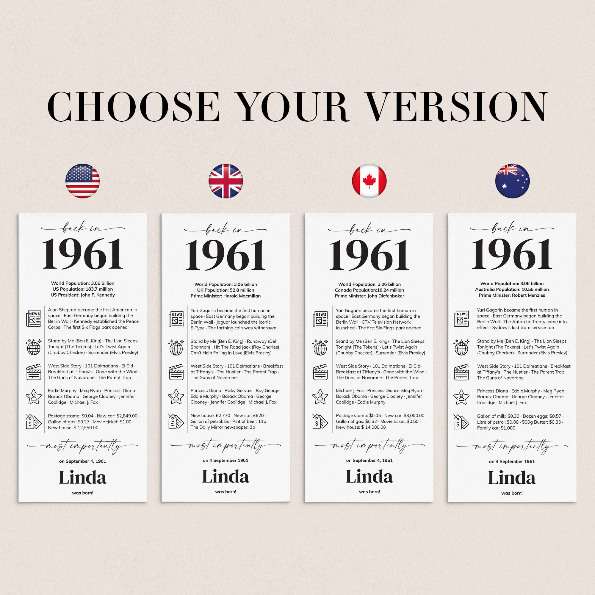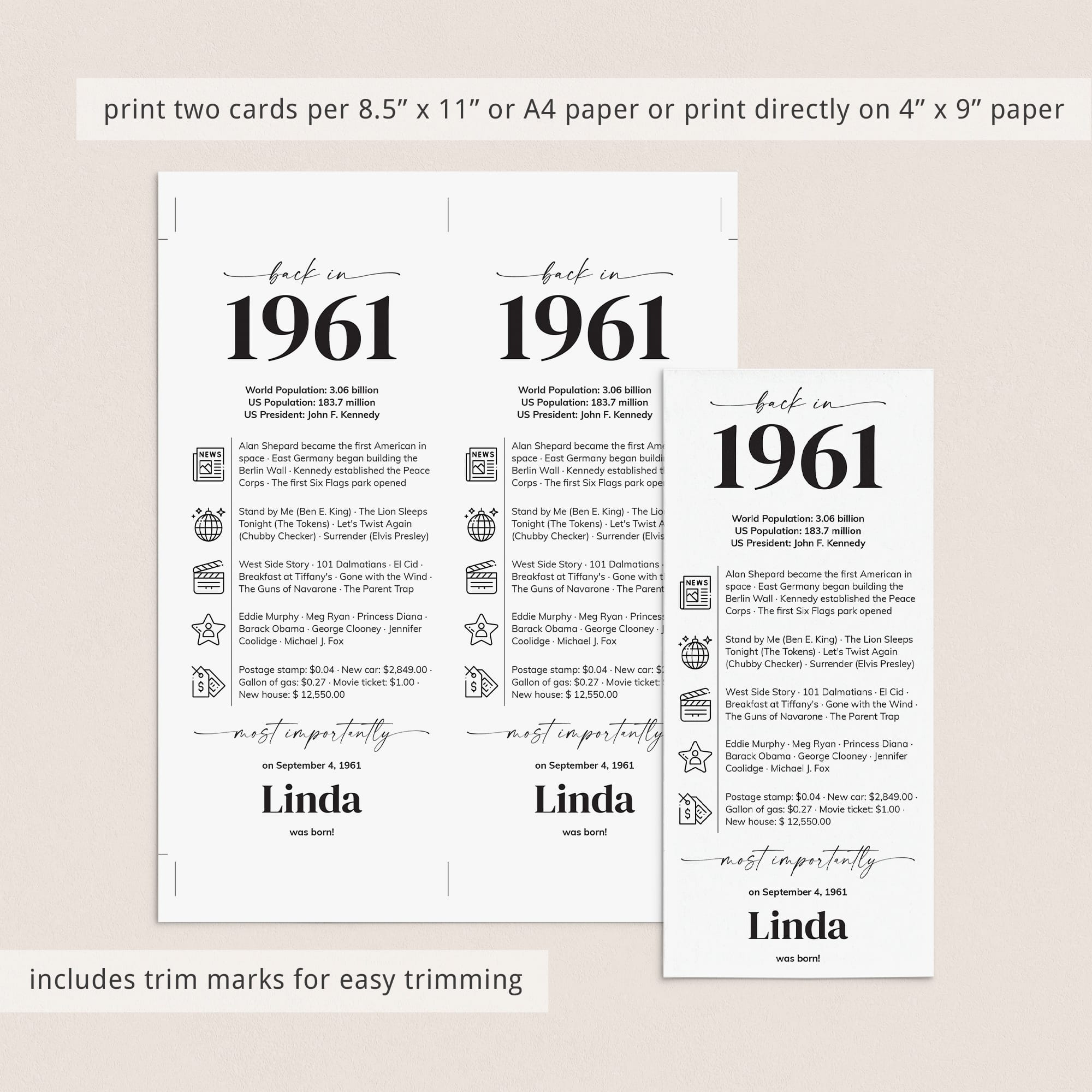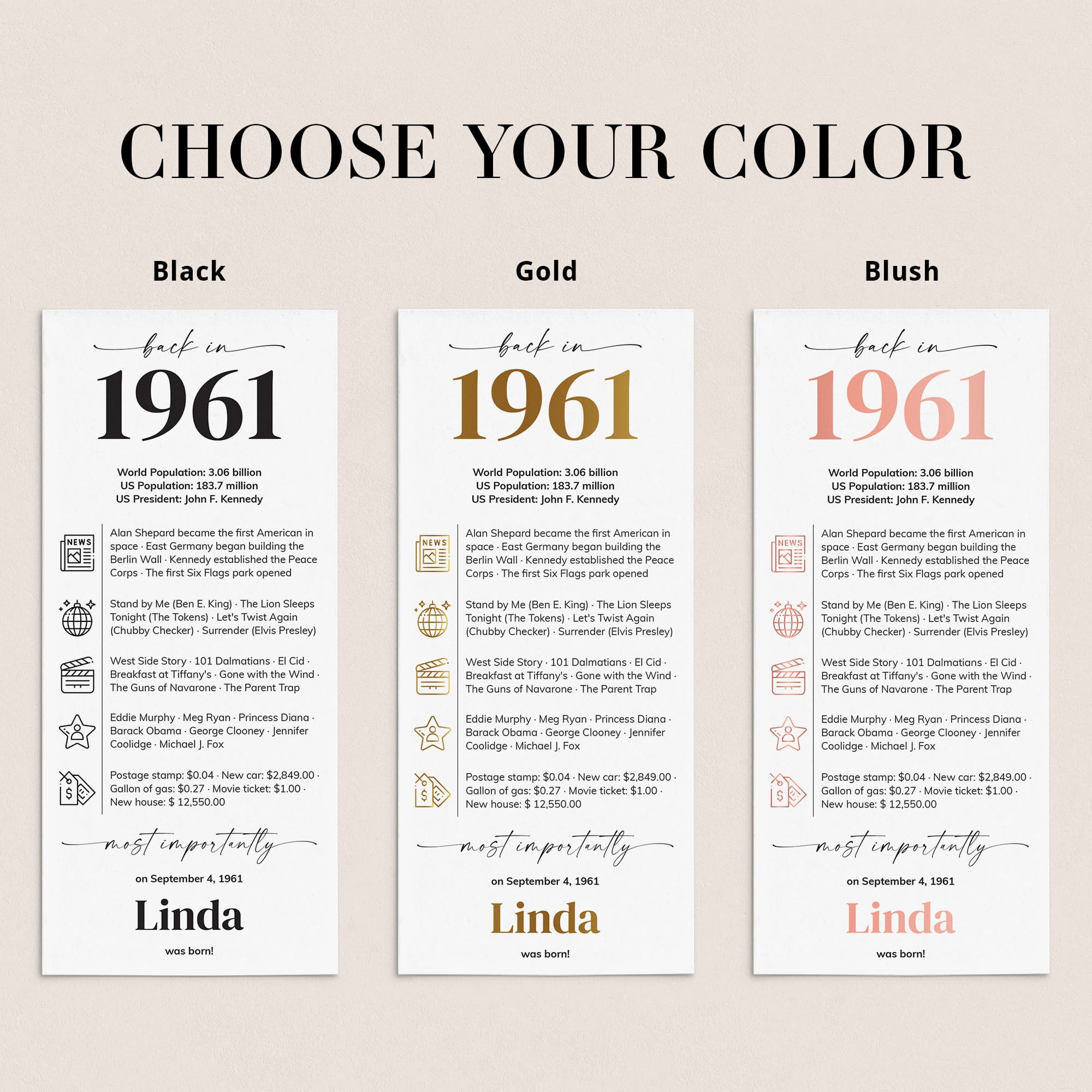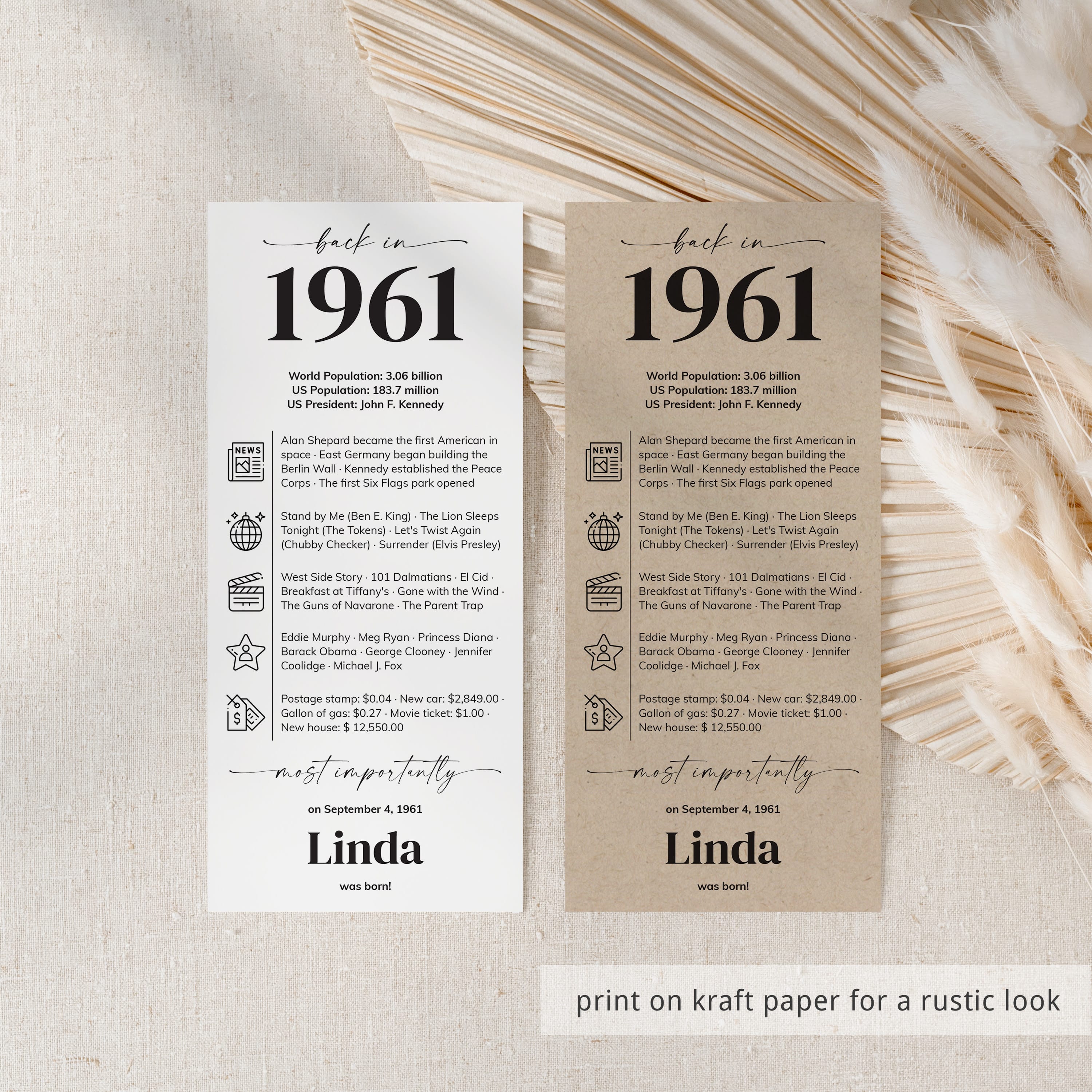Personalized with the honoree’s name and birth date, this design combines entertaining facts from 1961 with clean icons for a fresh, contemporary look.