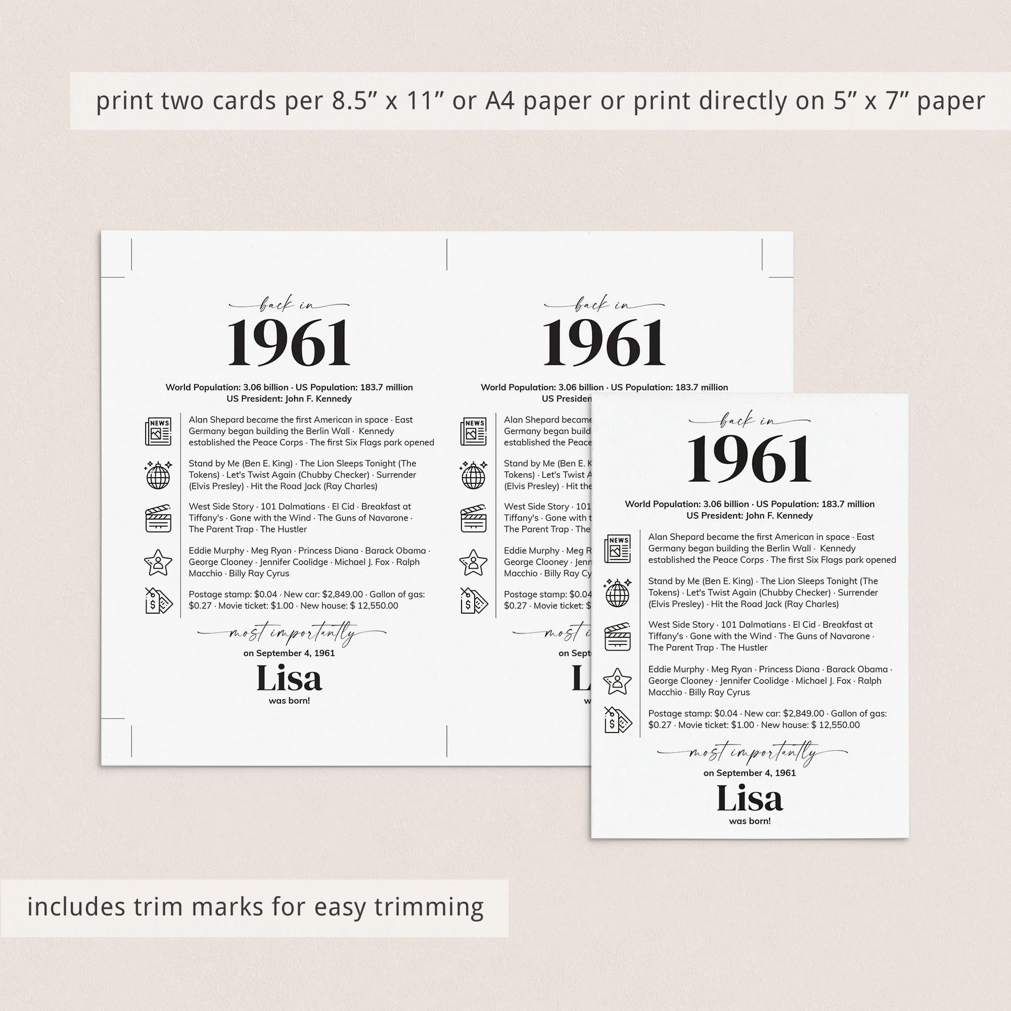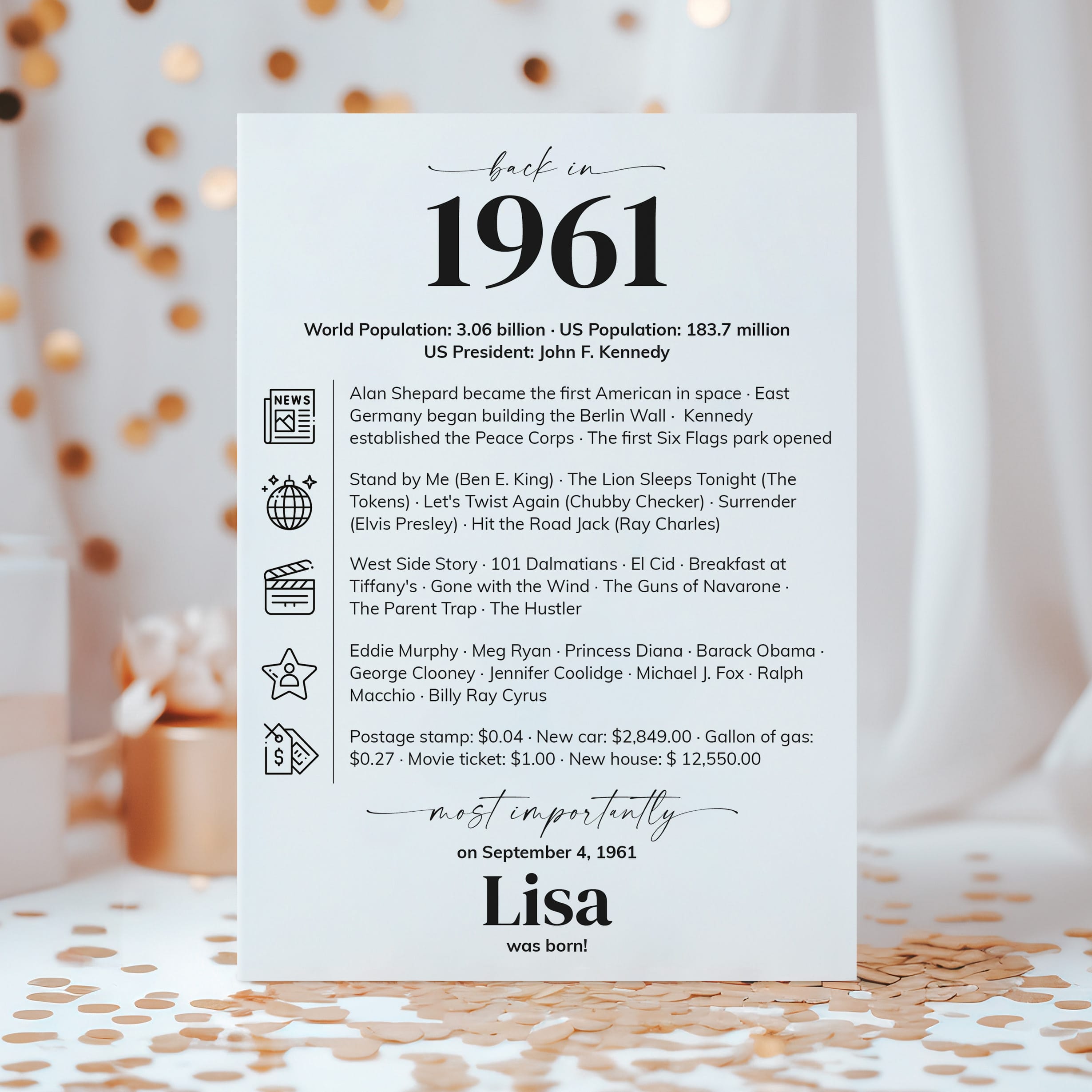 Looking for a stylish way to add a personal touch to a 65th birthday party? Our “Back in 1961” table card is a sleek and modern addition to any 65th birthday celebration in 2026. Personalized with the honoree’s name and birth date, this design combines entertaining facts from 1961 with clean icons for a fresh, contemporary look.