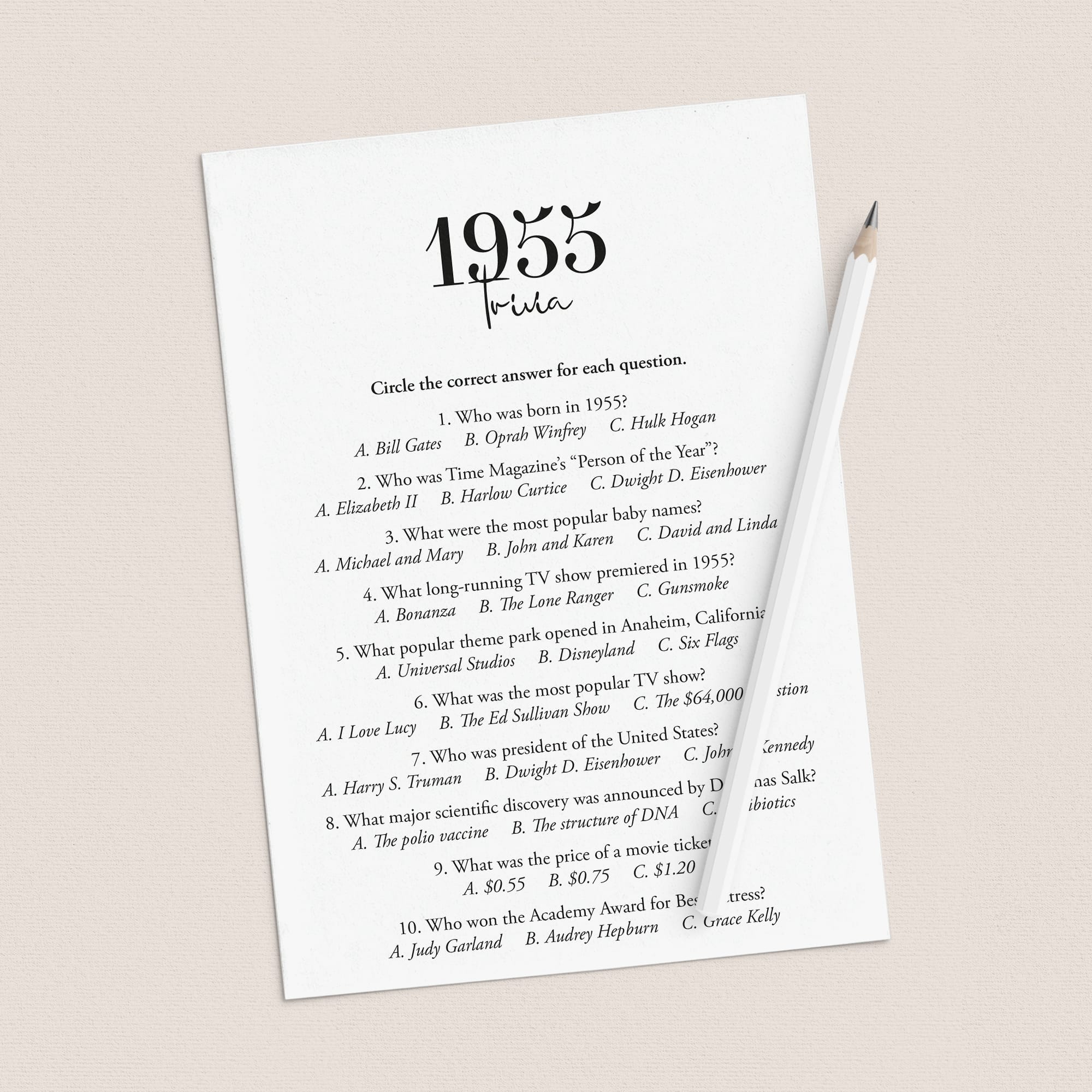 Celebrate a man’s 70th birthday in style with this 70th Birthday Games Bundle! This printable set, designed with a modern and minimalist aesthetic, includes 3 engaging and meaningful games and activities. From a nostalgic 1955s trivia game to heartfelt favorite memory cards, this bundle adds the perfect touch to his milestone celebration.