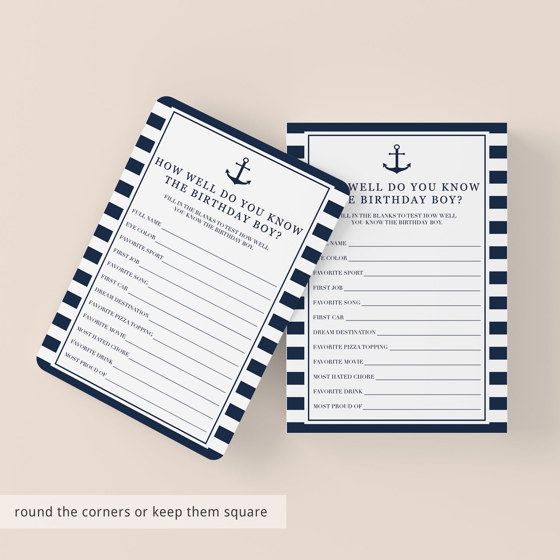 Test your birthday party guests how well they know the birthday boy and play 'How well do you know the birthday boy’ with this navy and white birthday game for adults and teens. This birthday game for him is a great way to bring disparate people together and to put them all in a party mood. It's the perfect addition to your guys birthday party.