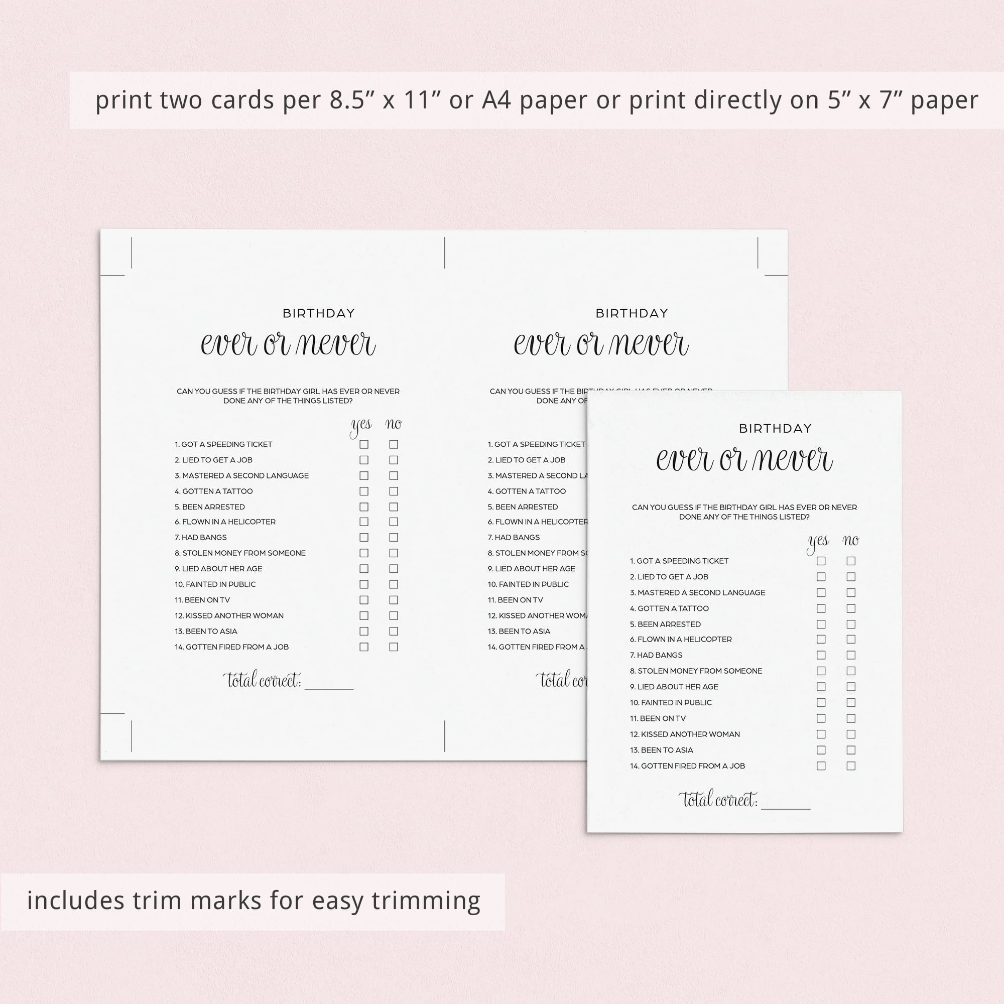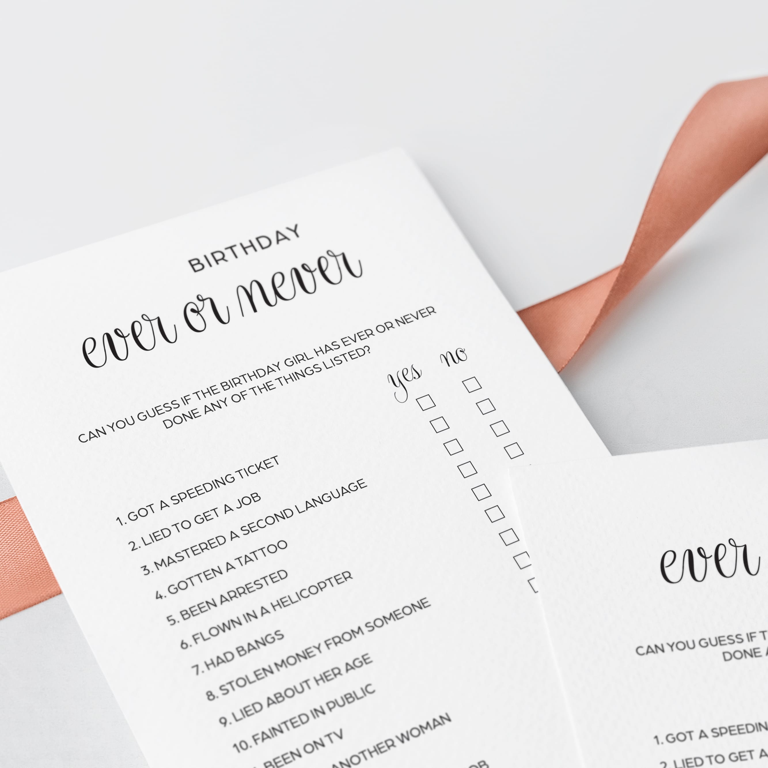 This Ever or Never birthday game is an instant download. After purchase you will receive a download link immediately on screen. Also within minutes of your order and payment, an e-mail will be sent to you with a link for your download.