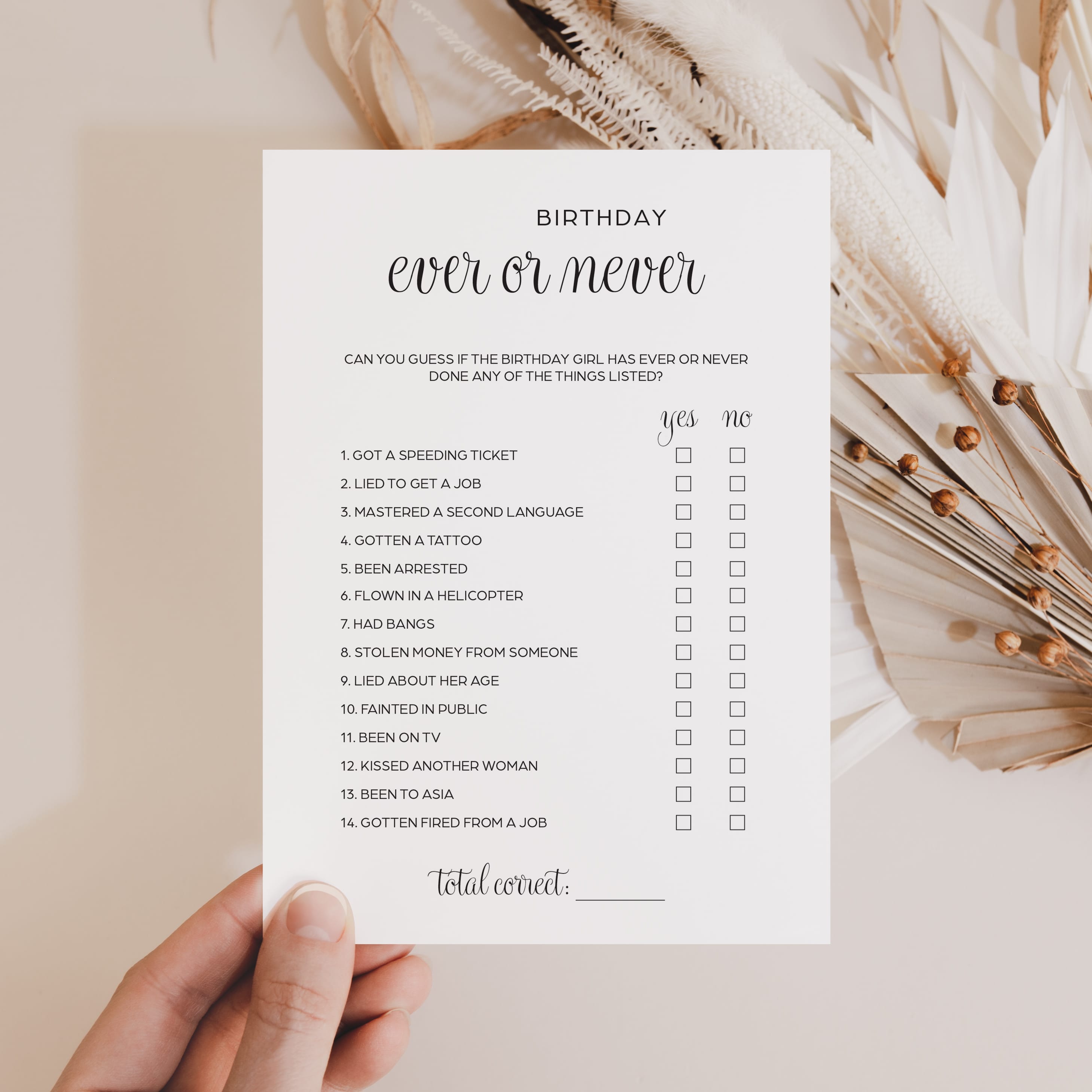 Are you looking for a hilarious birthday party game for her? Play Ever or Never! Whether you're celebrating your BFF's 30th birthday, your co-worker's turning "forty and fabulous," or your mother's turning 57 for the twelfth time, this fun and easy birthday party game will have guests reminiscing of years gone by.