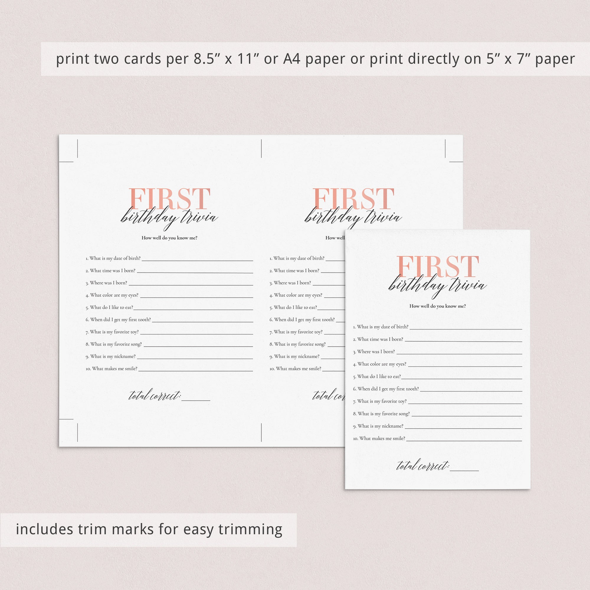 Are you looking for a fun game for your baby's first birthday party? Test your guests how well they know the birthday girl and play first birthday trivia with this blush 'How well do you know the birthday girl’ game. This first birthday quiz for girl is a great way to bring disparate people together and to put them all in a party mood. It's the perfect addition to your girl's first birthday party.