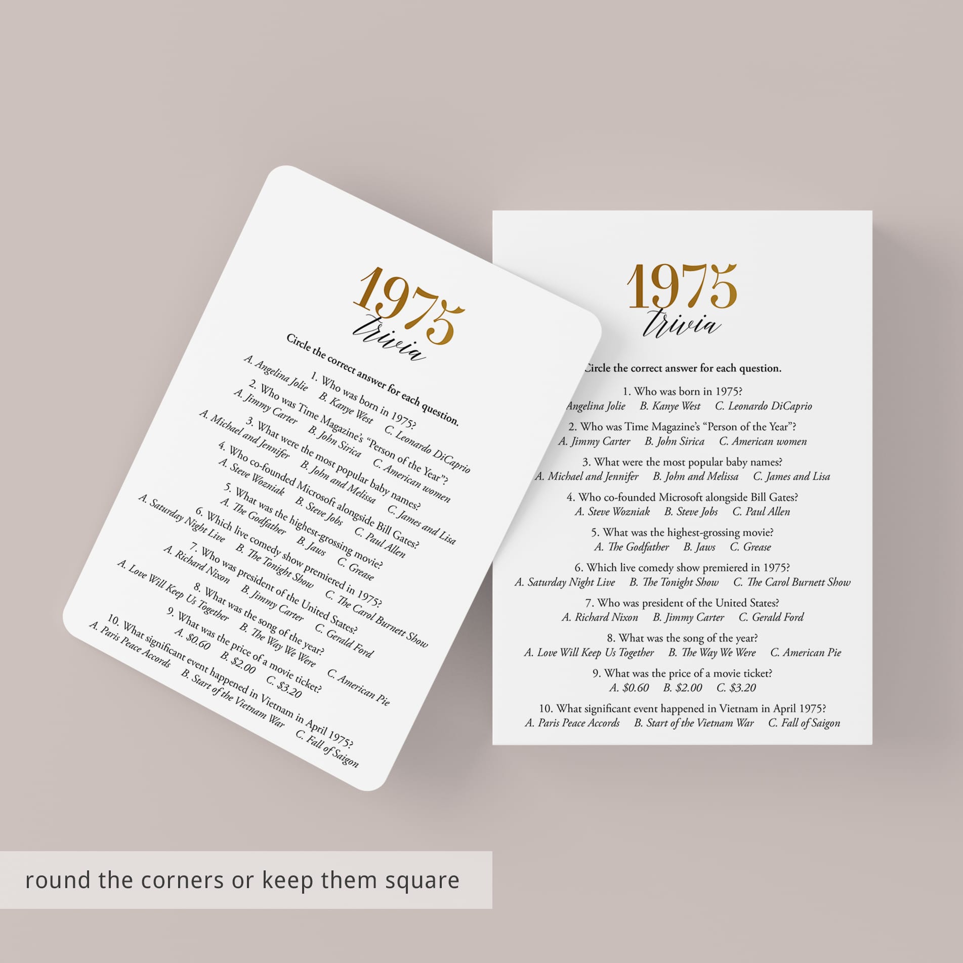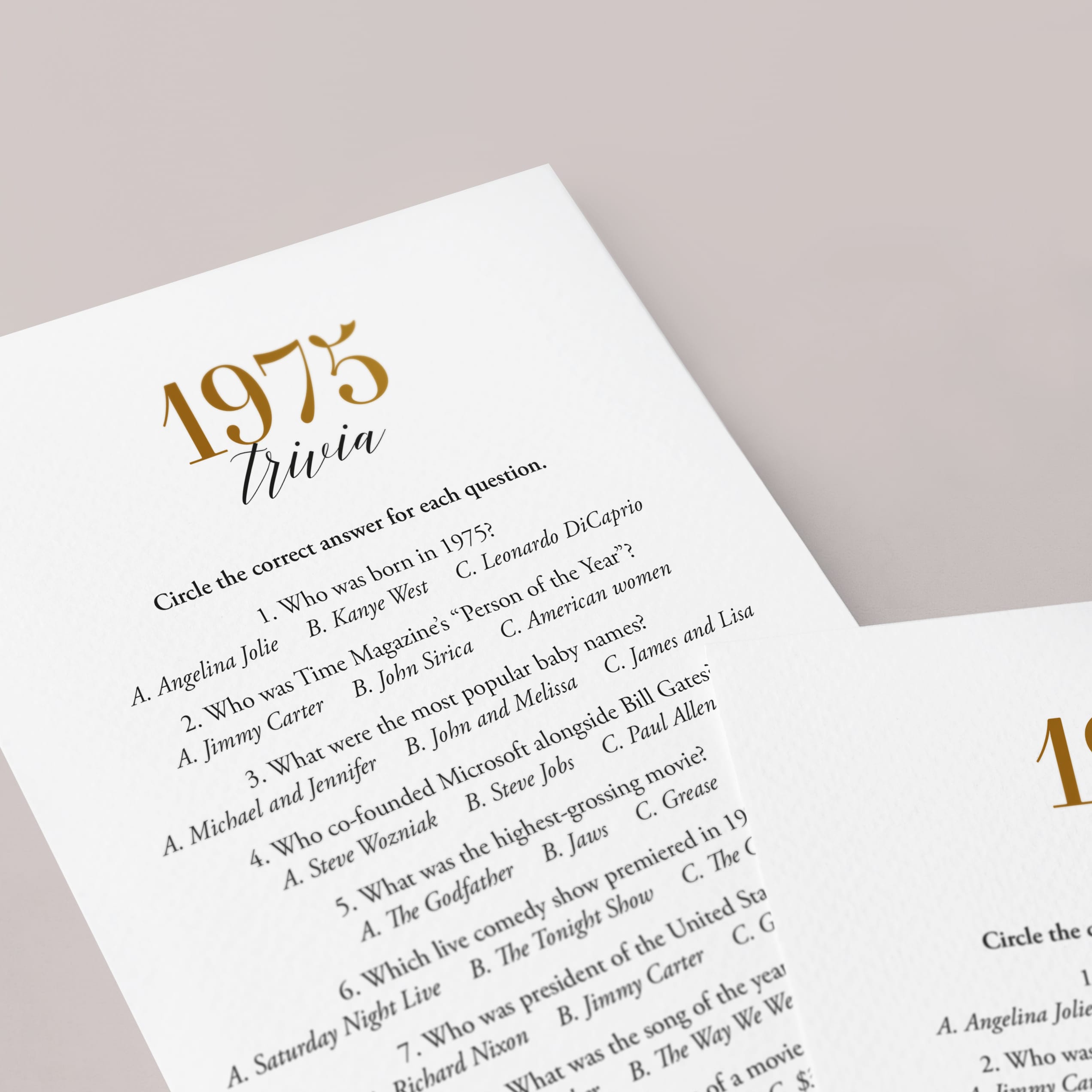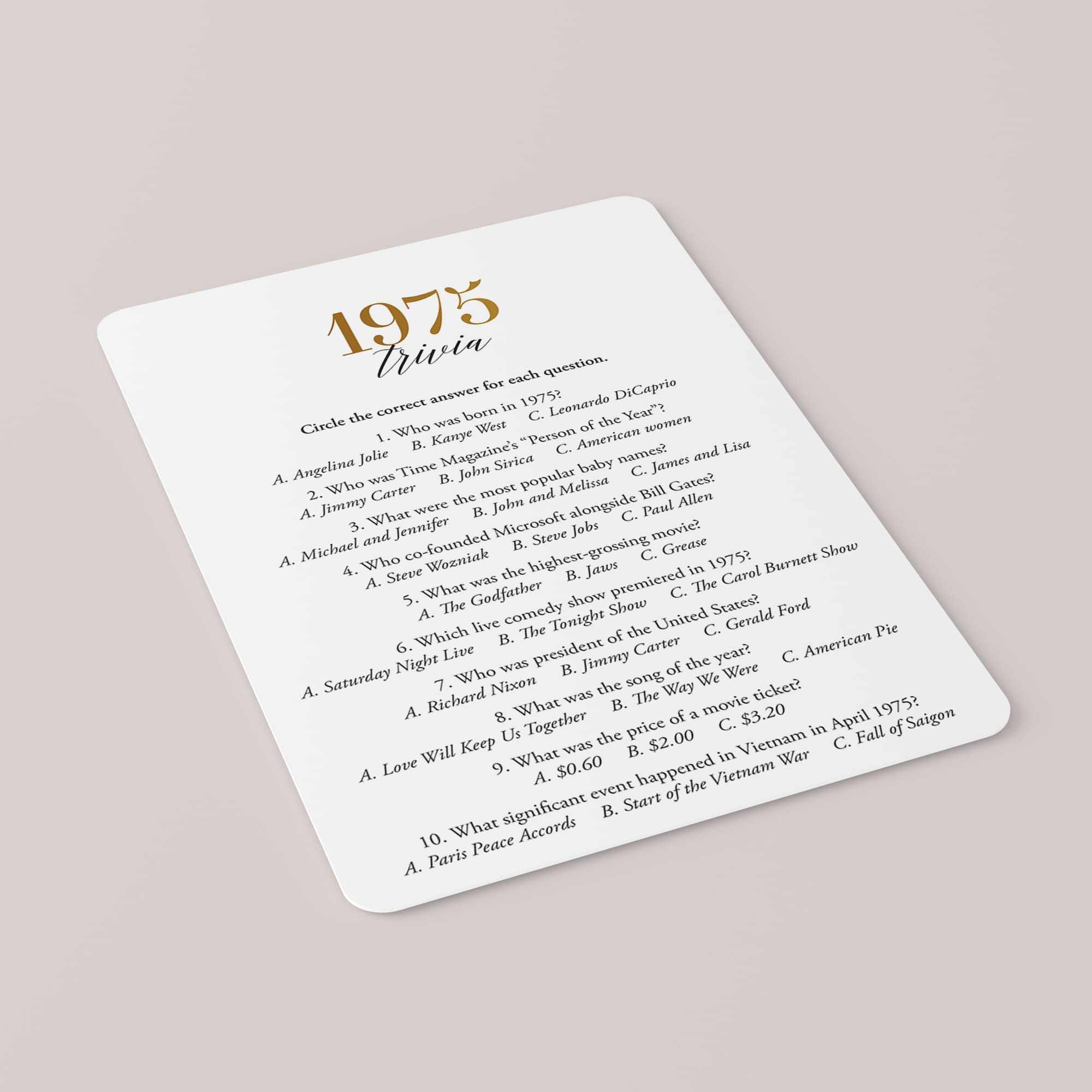Are you looking for a fun game for a 50th anniversary or 50th birthday party? Look no further! This modern gold 1975 trivia game with 10 multiple choice questions is such a fun game to play with your friends and family. Test your guests how well they know 1975's pop culture.