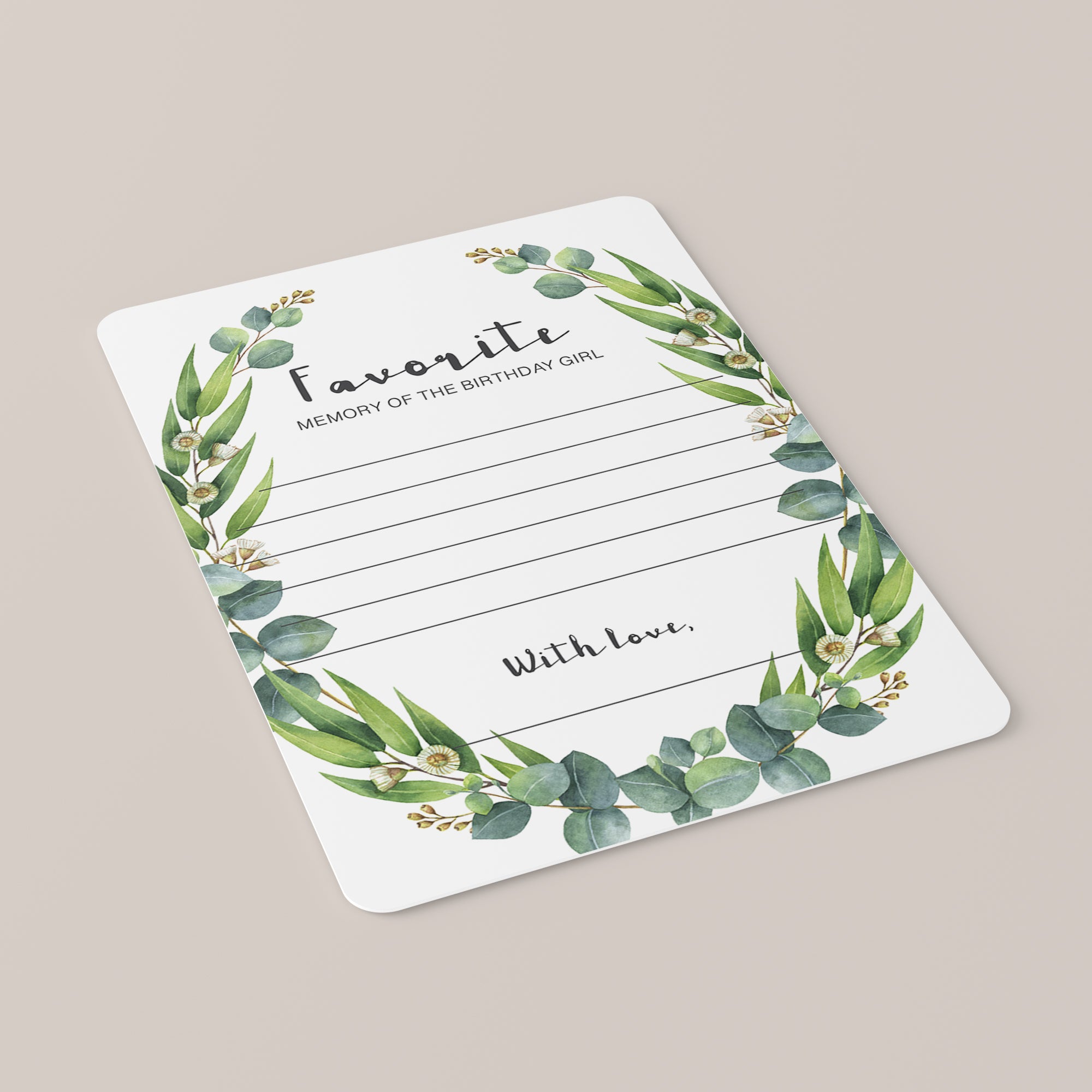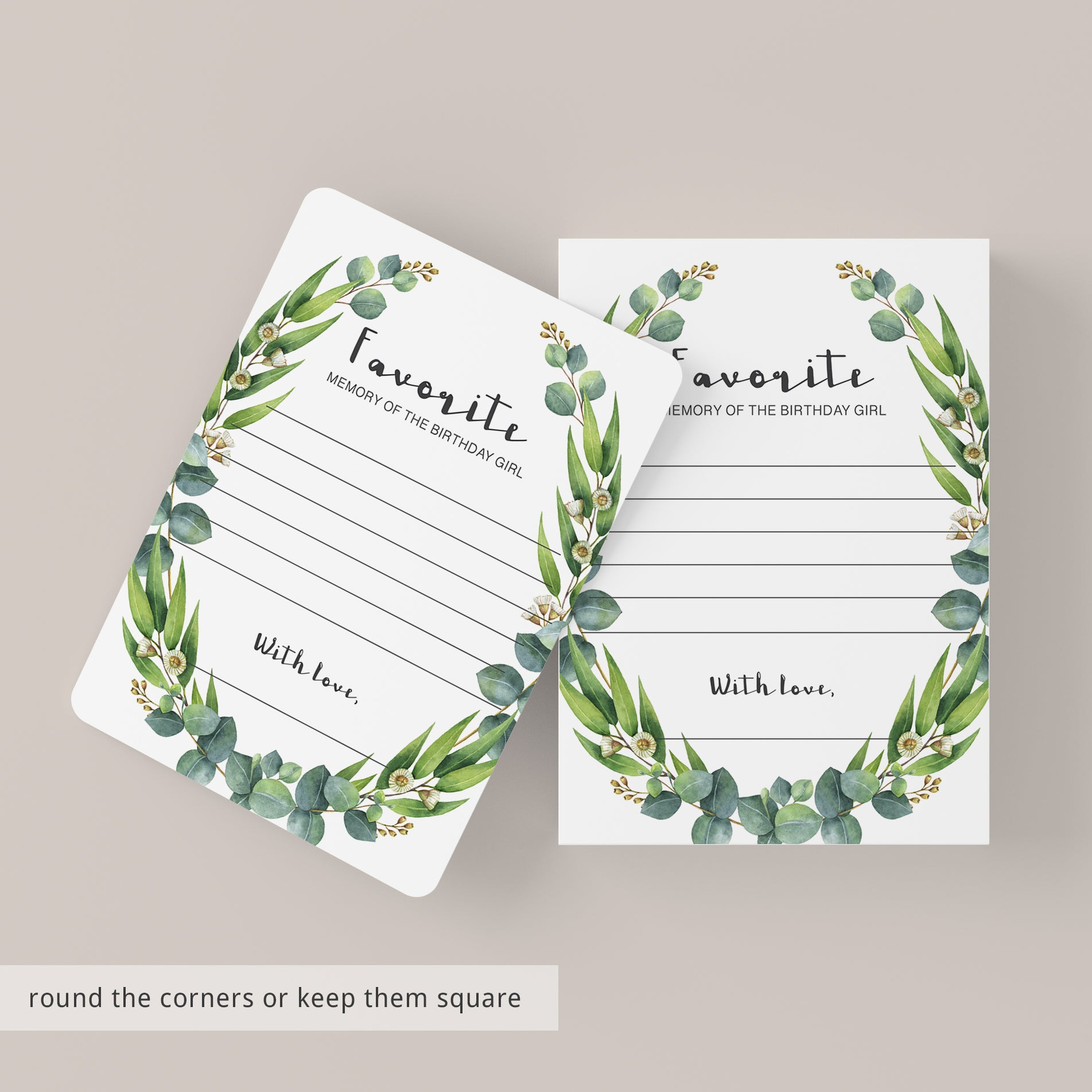 Are you looking for a memorable icebreaker game for your women's birthday party? Have your guests share their Favorite Memory of The Birthday Girl with these greenery game cards with watercolor eucalyptus leaves. It's the perfect addition to your botanical themed birthday party and it's sure to be a hit at your party!