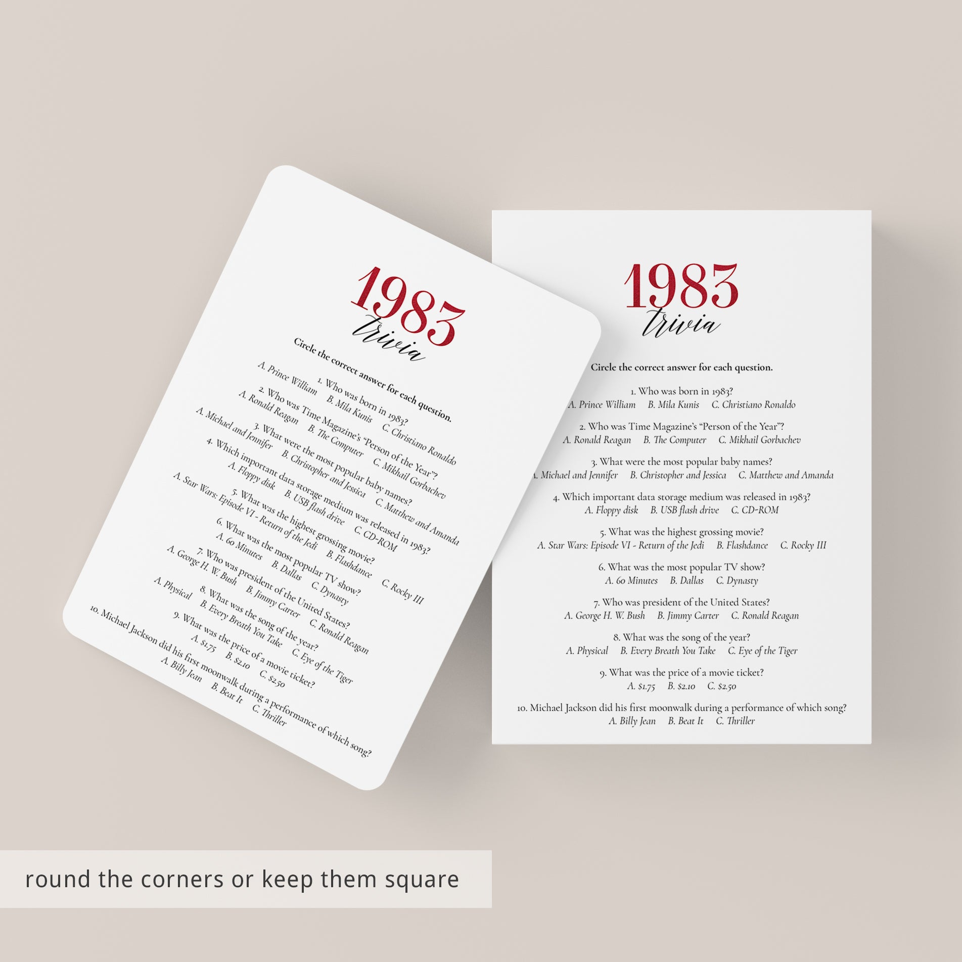 This ruby 1983 trivia is an instant download. After purchase you will receive a download link immediately on screen. Also within minutes of your order and payment, an e-mail will be sent to you with a link for your download.