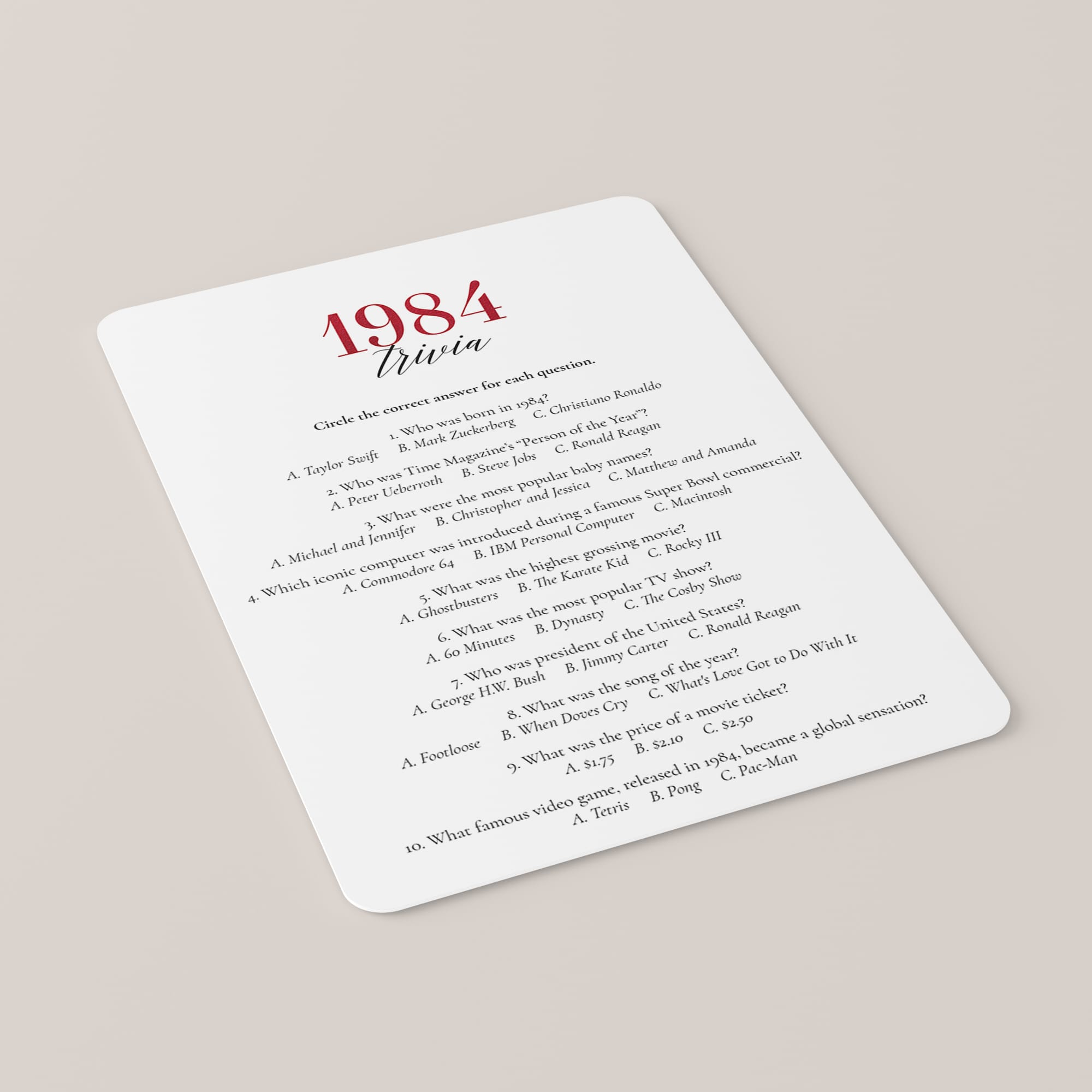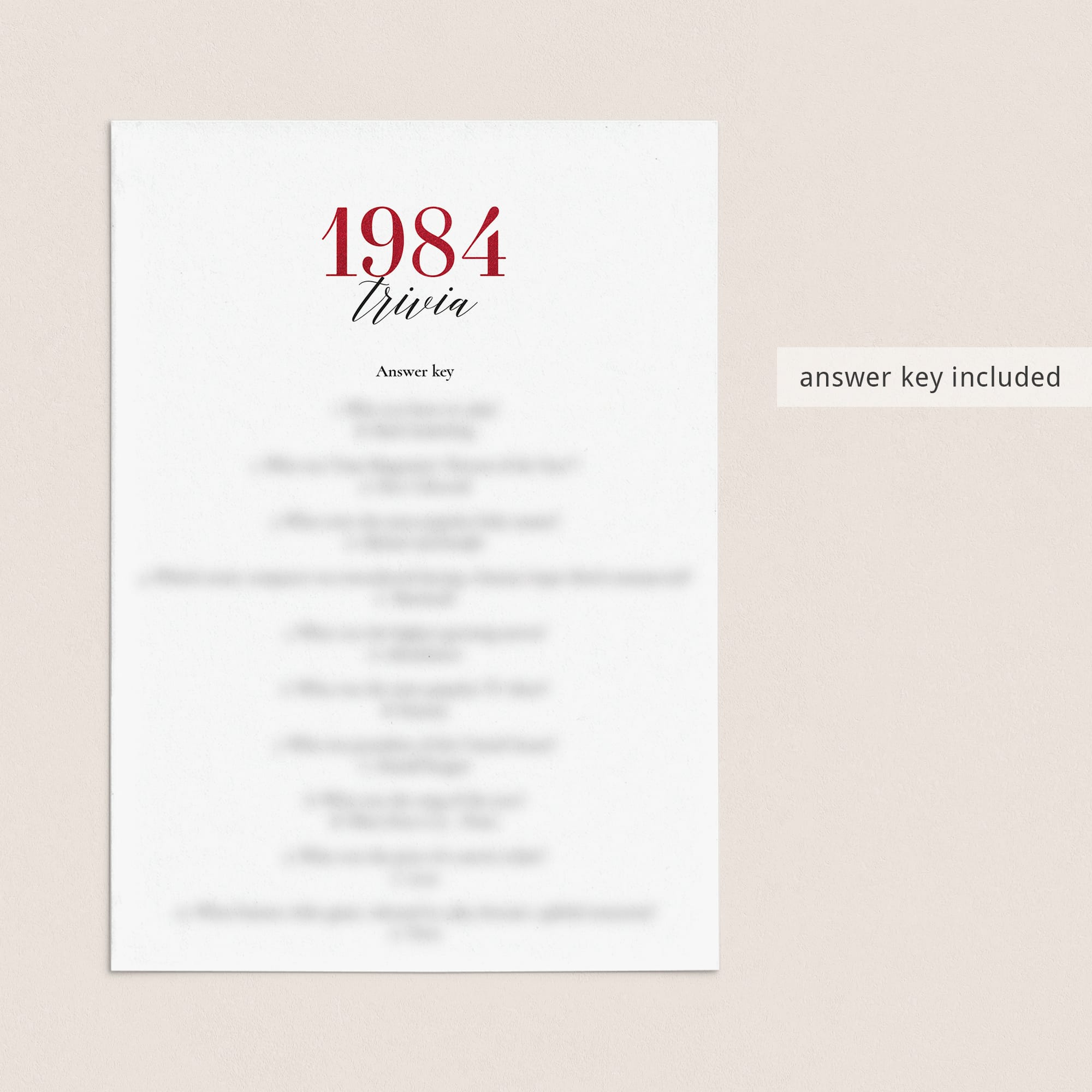 Just in case you are having trouble figuring out the answers, an answer key with the 1984 trivia answers is included.