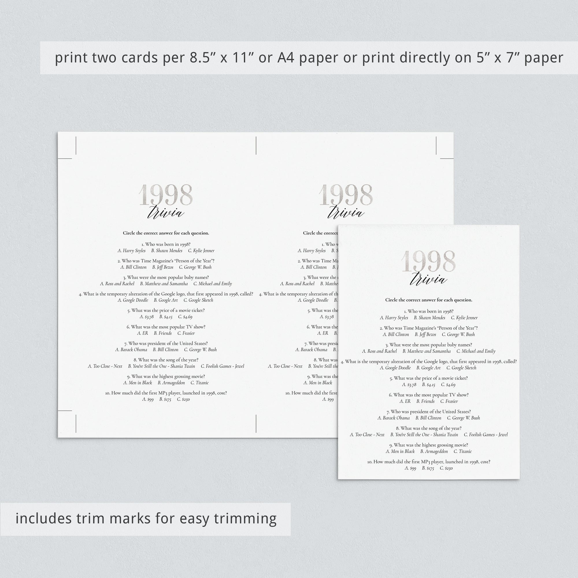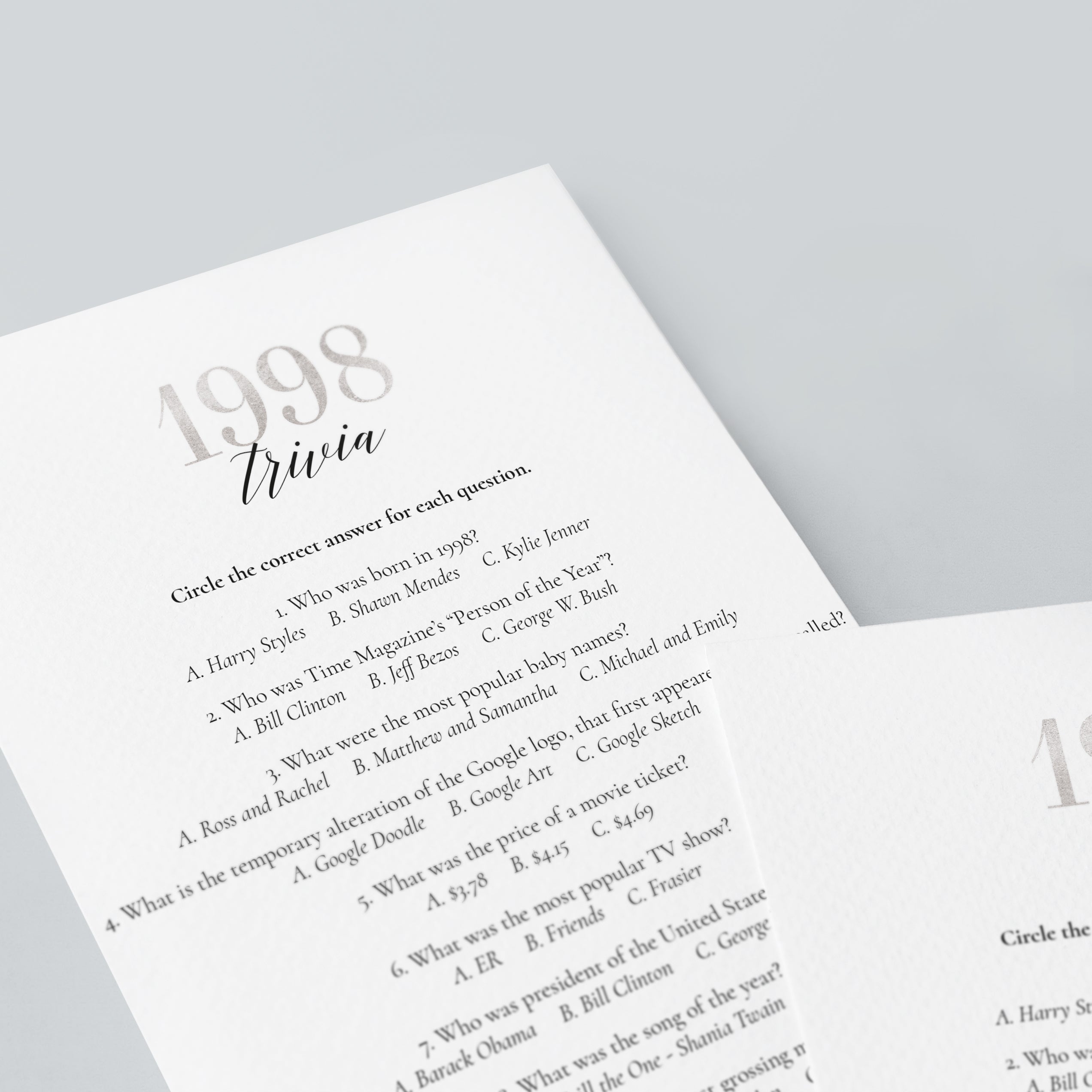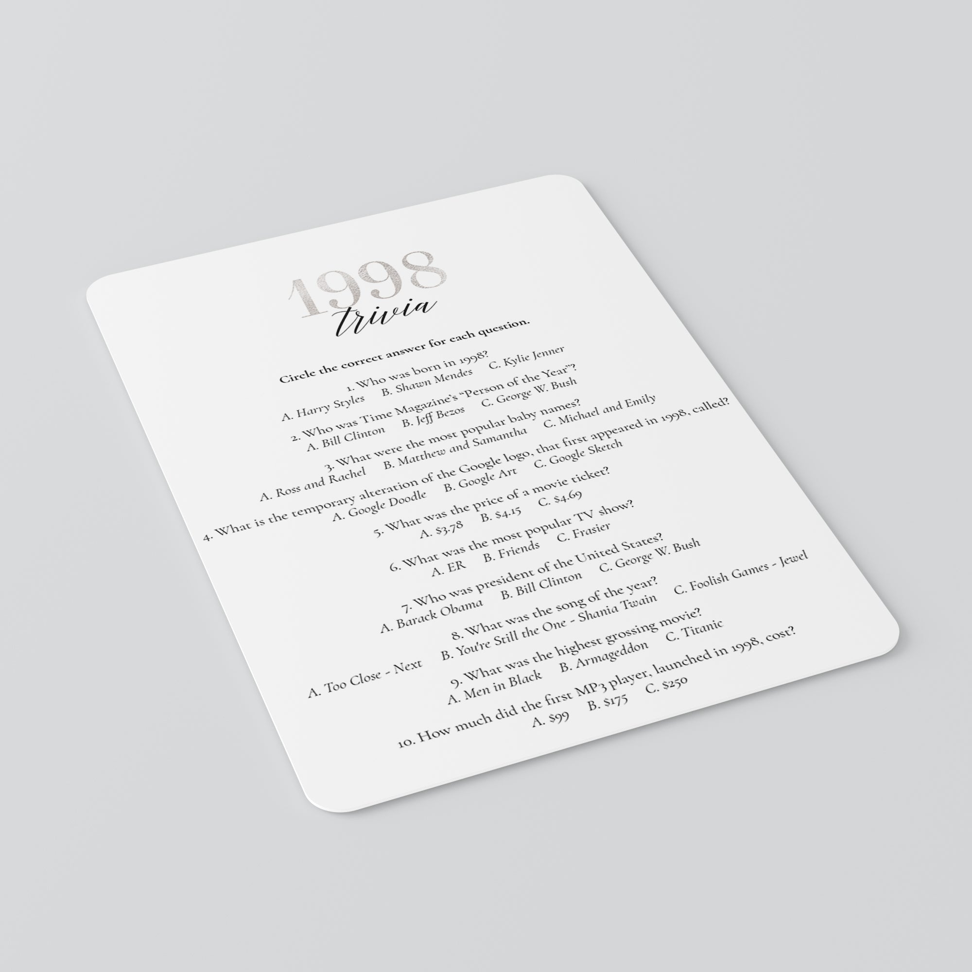 Are you looking for a fun game for a 27th anniversary or 27th birthday party? Look no further! This silver 1998 trivia game is such a fun game to play with your friends and family. Test your guests how well they know 1998's pop culture.