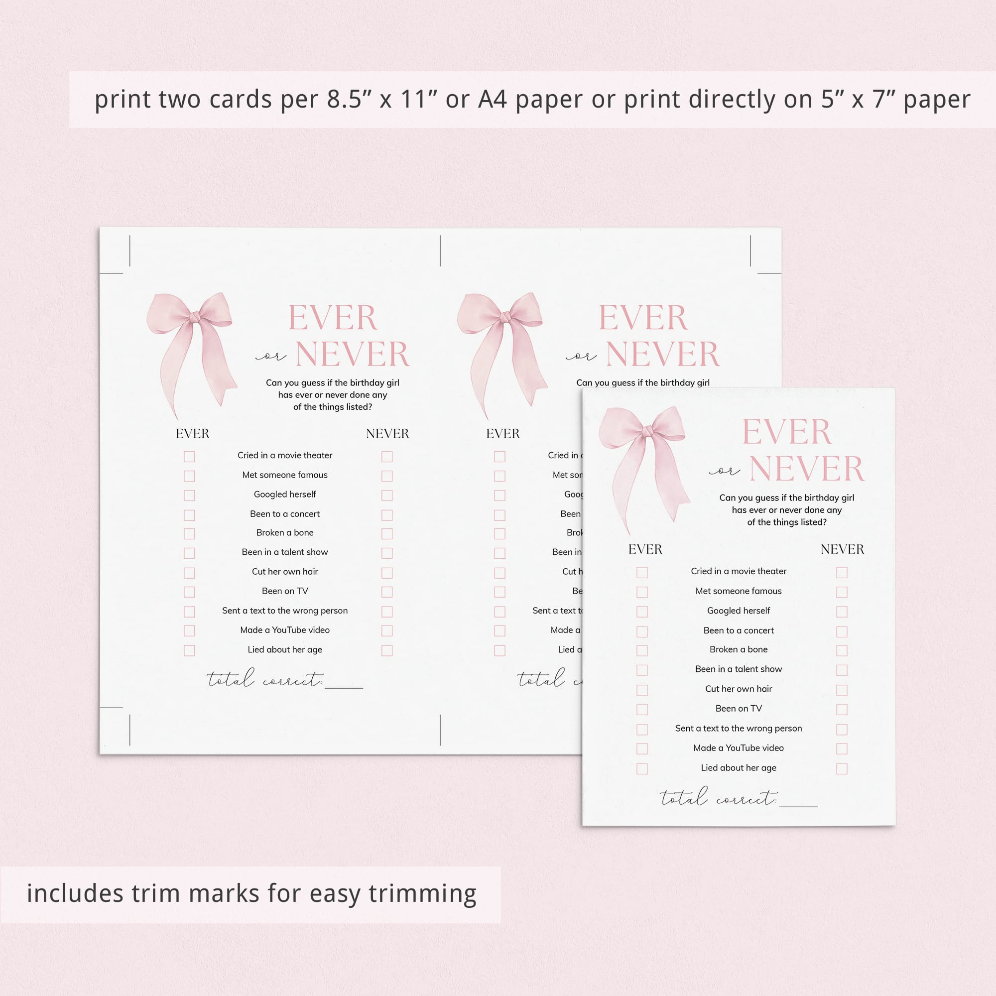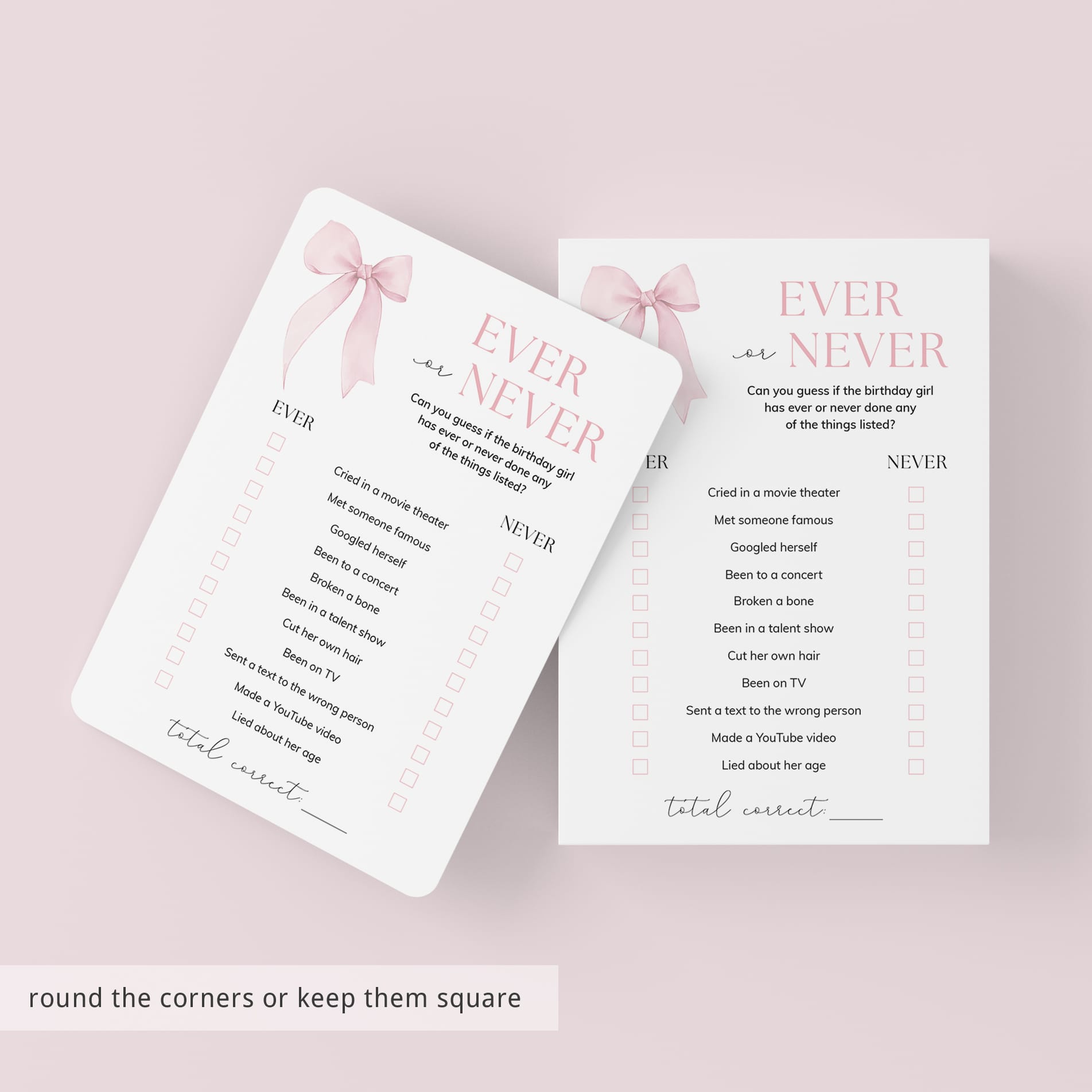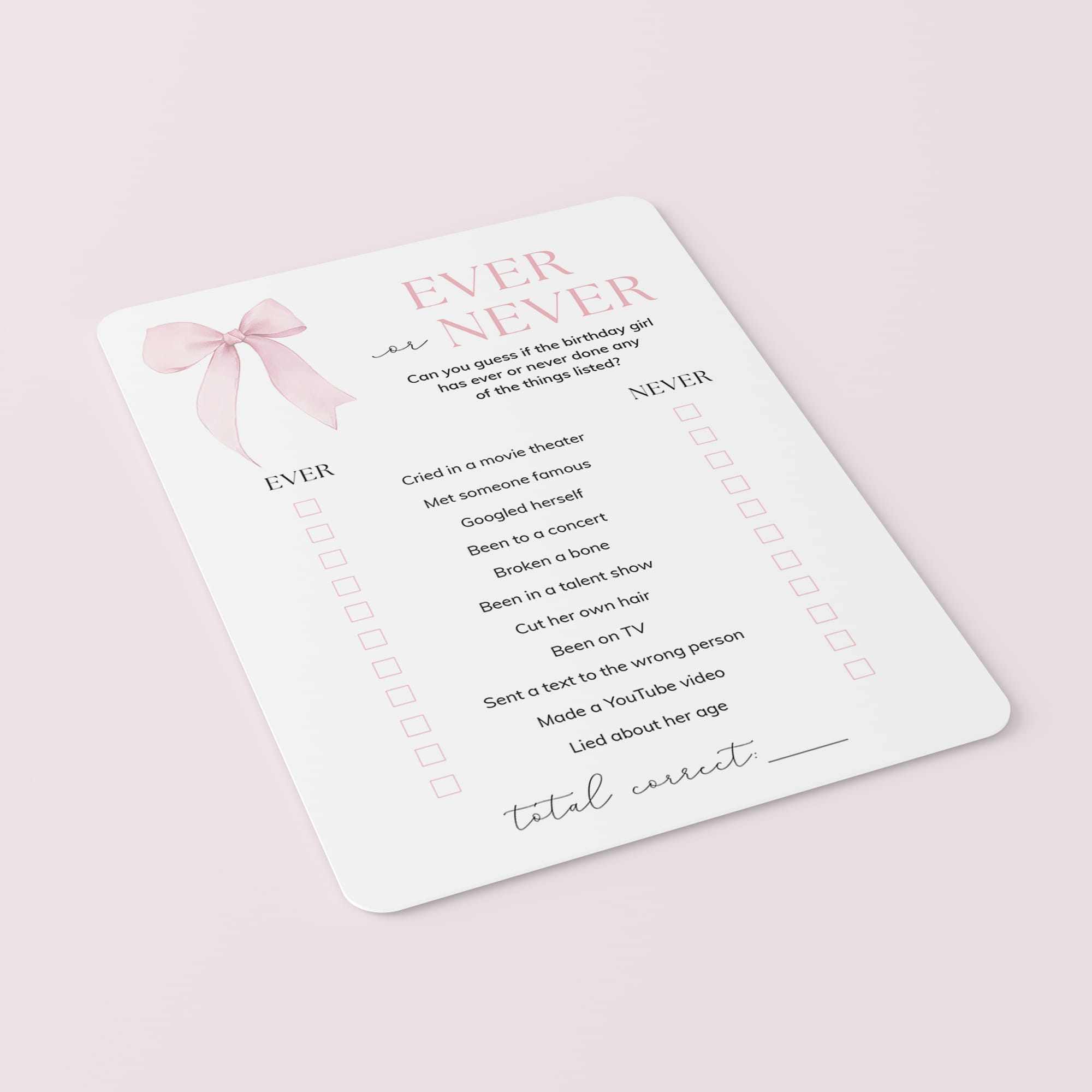 Looking for a hilarious birthday game for a teen girl? Play Ever or Never! This fun and easy party game, decorated with a cute pink bow design, is sure to get everyone laughing and sharing stories.