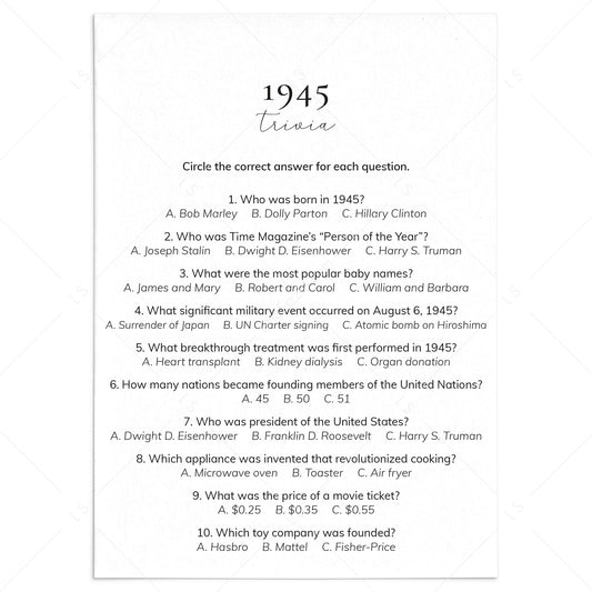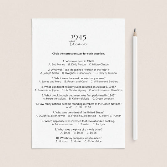 Are you looking for a fun quiz for a 80th birthday party? Look no further! This 1945 Quiz with 10 multiple choice questions is such a fun game to play with your friends and family. Test your guests how well they know 1945's pop culture. It's...- $4.49