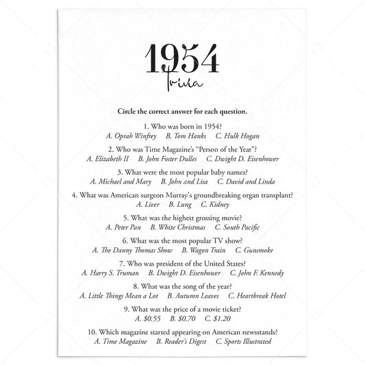 Are you looking for a fun game for a 71st birthday party? Look no further! This modern minimalist 1954 trivia is such a fun game to play with your friends and family. Test your guests how well they know 1954's pop culture. It's the perfect addition to...- $4.49