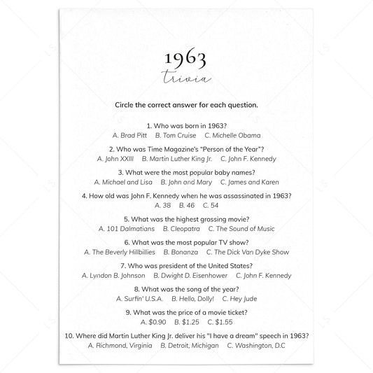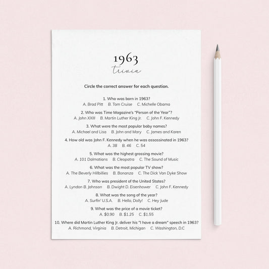 Are you looking for a fun quiz for a 62nd birthday party or 62nd anniversary? Look no further! This 1963 Quiz is such a fun game to play with your friends and family. Test your guests how well they know 1963's pop culture. It's the perfect addition...- $4.49