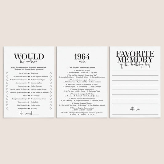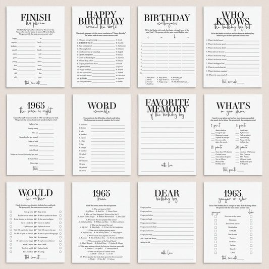 Celebrate a man born in 1965 with this 60th Birthday Games Bundle. Designed with a modern and minimalist style, this printable bundle includes 12 fun and meaningful games and activities, from nostalgic 1965 trivia quizzes to heartfelt wishes cards and keepsakes. It's the perfect way...- $15.99