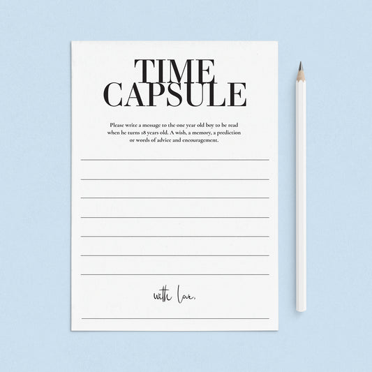 Are you looking for a meaningful keepsake for your baby boys' first birthday party? Have your guests leave a special message for your son to open on his 18th birthday. These modern black and white Time Capsule cards will make a sweet and sentimental first...- $4.49