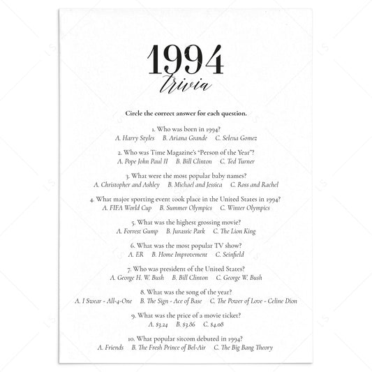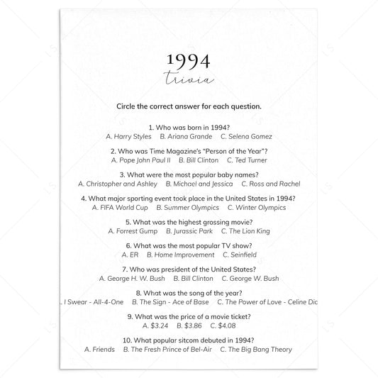 Are you looking for a fun game for a 31st birthday party or 31st anniversary? Look no further! This 1994 fun facts quiz with 10 multiple choice questions is such a fun trivia game to play with your friends and family. Test your guests how well they...- $4.49