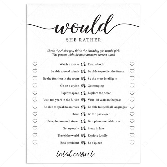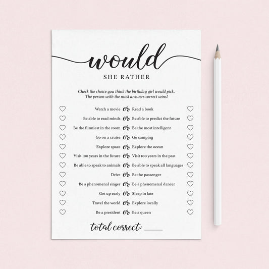 Are you looking for the perfect icebreaker to get people talking and in the party mood for your birthday party? Play Would She Rather! After all, your guests have one thing in common: you know the birthday girl. This calligraphy script Would She Rather birthday game is...- $4.49