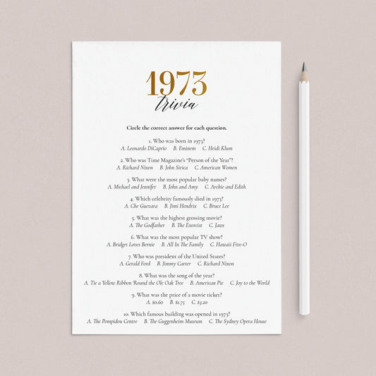Are you looking for a fun game for a 52nd anniversary or 52nd birthday party? Look no further! This modern gold 1973 trivia game is such a fun game to play with your friends and family. Test your guests how well they know 1973's pop culture.Just in case you...- $4.49
