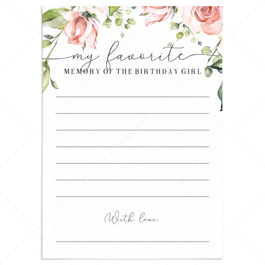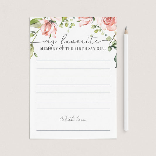 Are you looking for a memorable icebreaker game for your girl birthday party? Have everyone share their Favorite Memory of The Birthday Girl with these gorgeous blush floral game cards with watercolor flowers. It's the perfect addition to your floral themed girl birthday party and it's sure to be a hit.Let your guests write...- $4.49