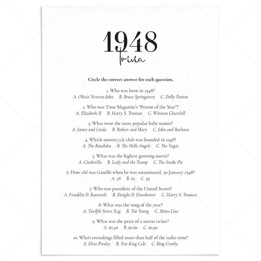 Are you looking for a fun game for a 77th birthday party? Look no further! This modern minimalist 1948 trivia with 10 multiple choice questions is such a fun game to play with your friends and family. Test your guests how well they know 1948's pop culture. It's...- $4.49