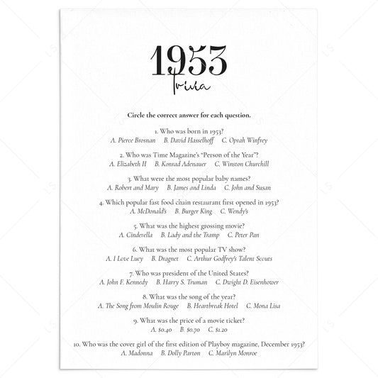 Are you looking for a fun game for a 72nd birthday party? Look no further! This modern minimalist 1953 trivia with 10 multiple choice questions is such a fun game to play with your friends and family. Test your guests how well they know 1953's pop culture. It's...- $4.49