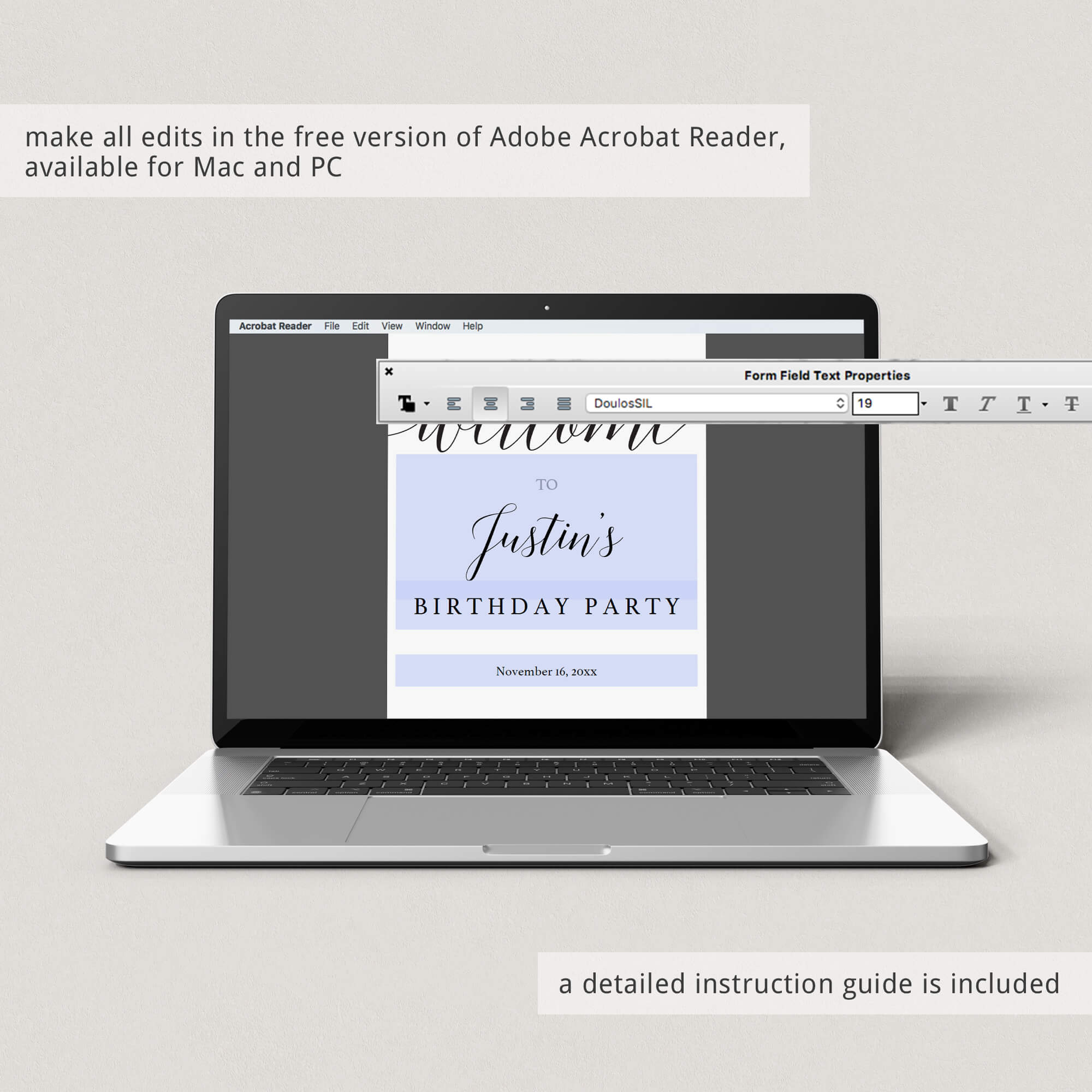 The sign is editable in the free version of Adobe Acrobat Reader, so it is available for any age: from first birthday parties, sweet sixteen parties to 30th, 50th and 60th birthday parties.