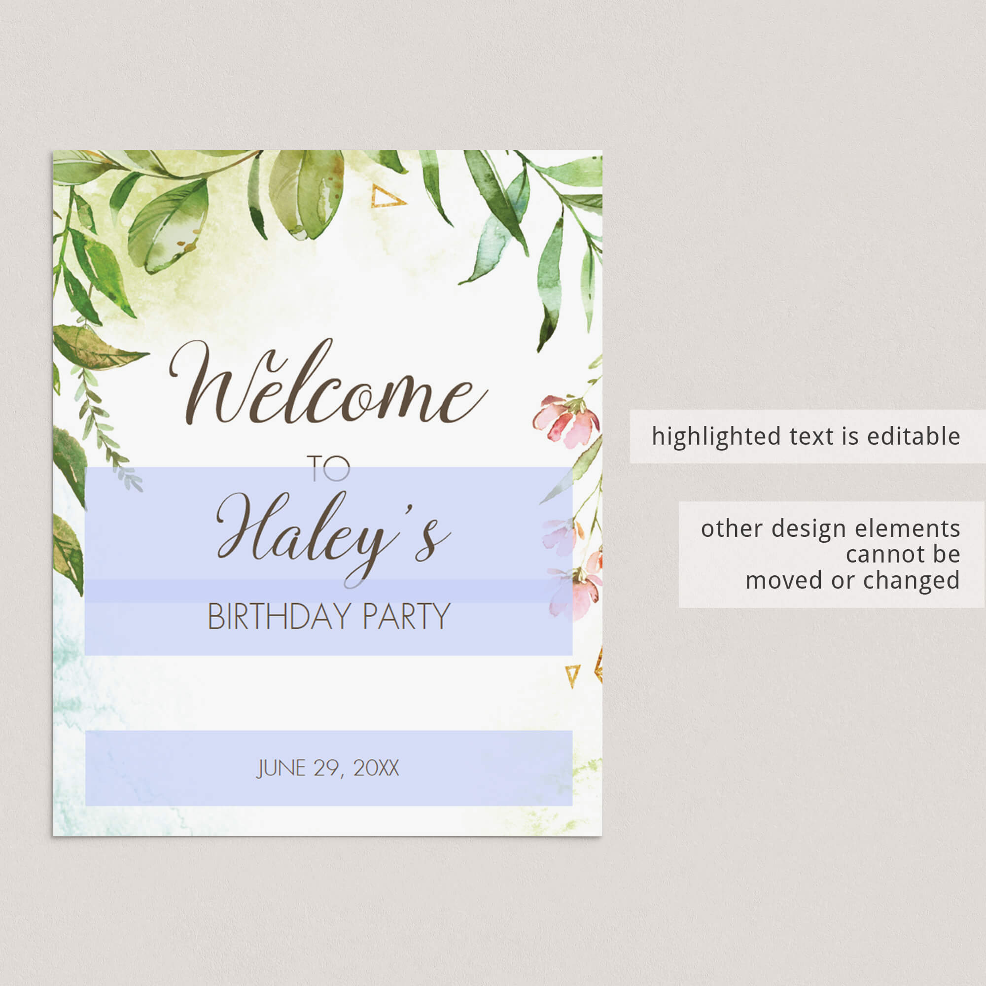 The garden themed sign is editable in the FREE version of Adobe Acrobat Reader, so it is available for any age: from first birthday parties, sweet sixteen parties to 30th, 50th and 60th birthday parties.