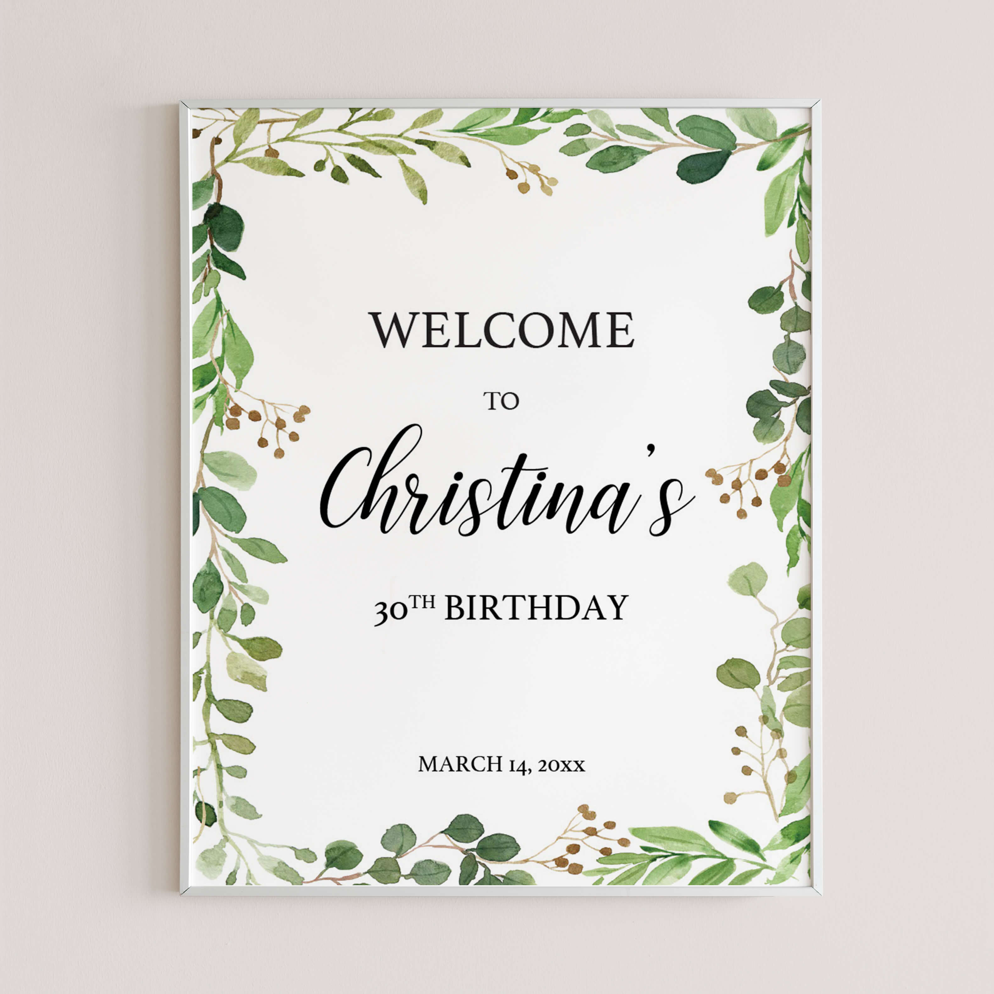 Print the greenery welcome board on card stock or card board to give it a sturdy look and display it in a frame or on a beautiful easel. This greenery party welcome board will instantly uplevel any party.