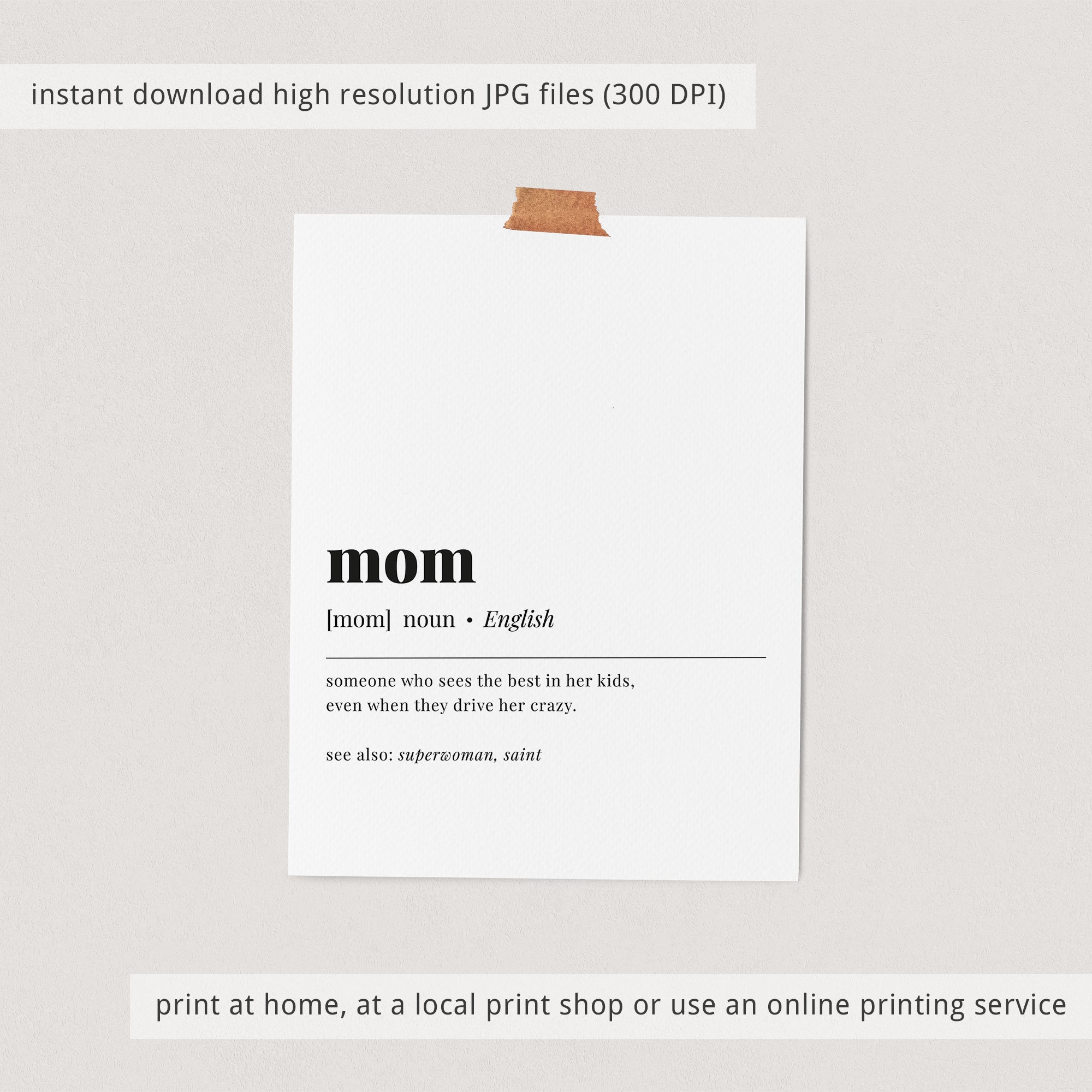 This dictionary-style meaning of the word 'mom' print is an instant download. After purchase you will receive a download link immediately on screen. Also within minutes of your order and payment, an e-mail will be sent to you with a link for your download.