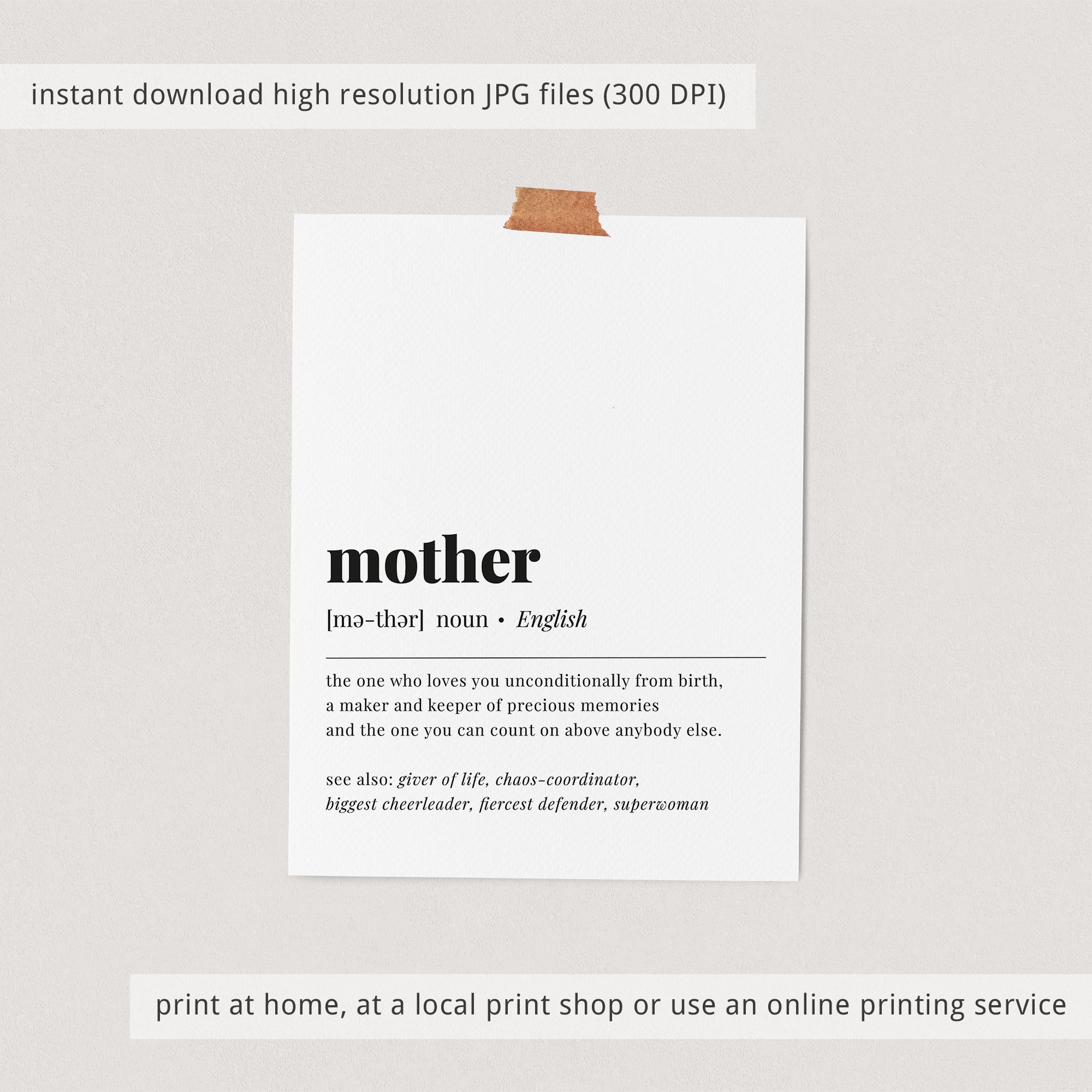 This dictionary-style meaning of the word 'mother' print is an instant download. After purchase you will receive a download link immediately on screen. Also within minutes of your order and payment, an e-mail will be sent to you with a link for your download.