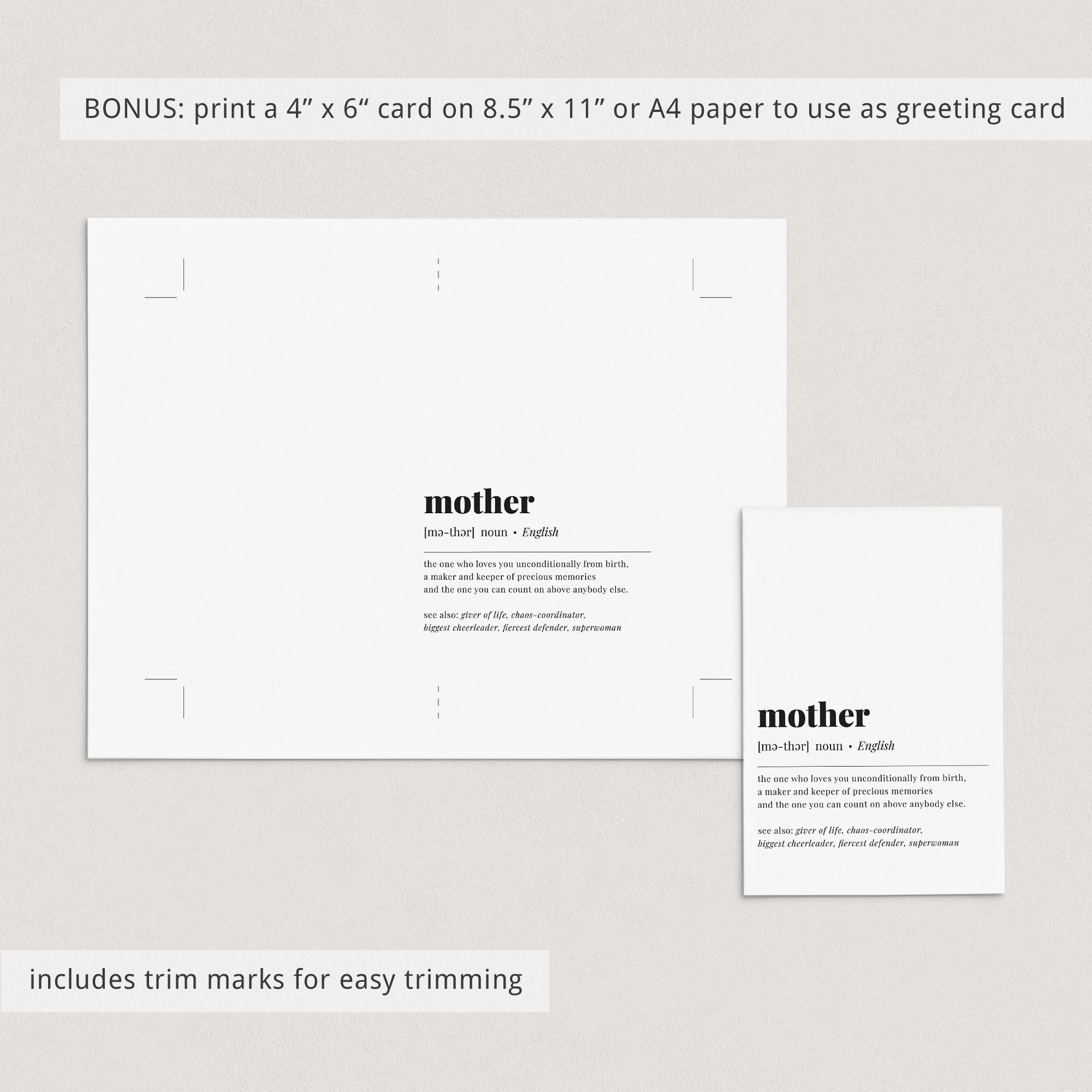 BONUS: an 8.5" x 11" sized JPG-file with trim marks for a folded 4" x 6" greeting card is included as well. Simply print on card stock, trim and fold in half.