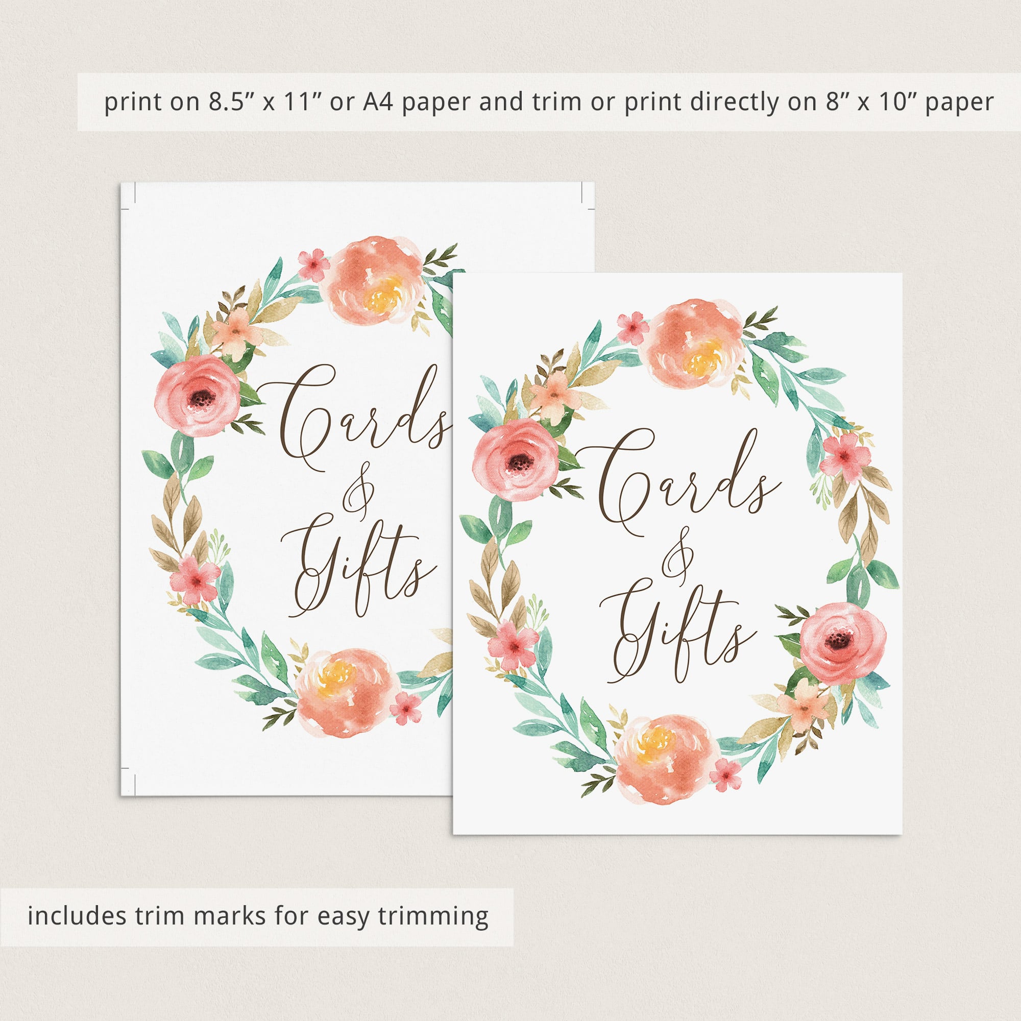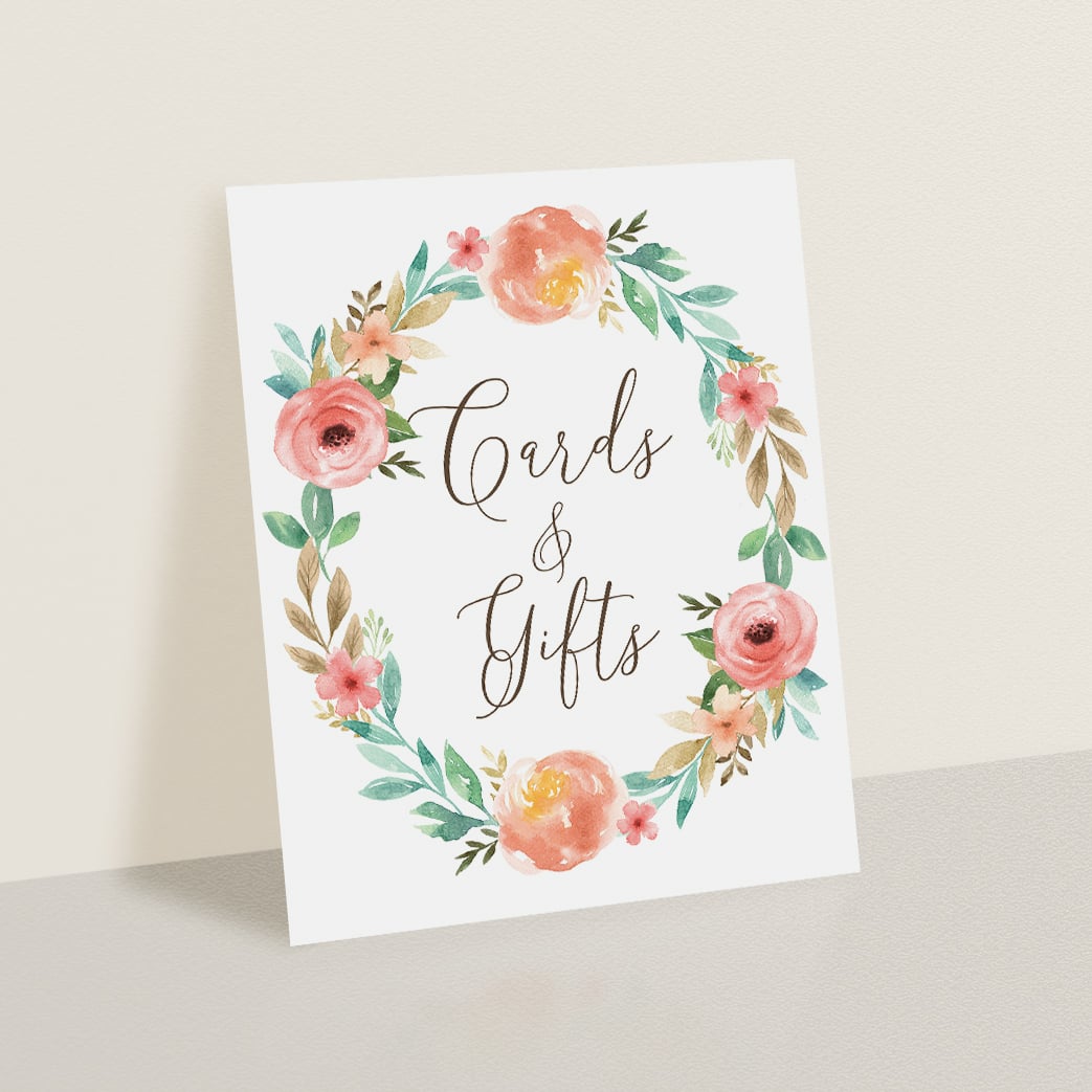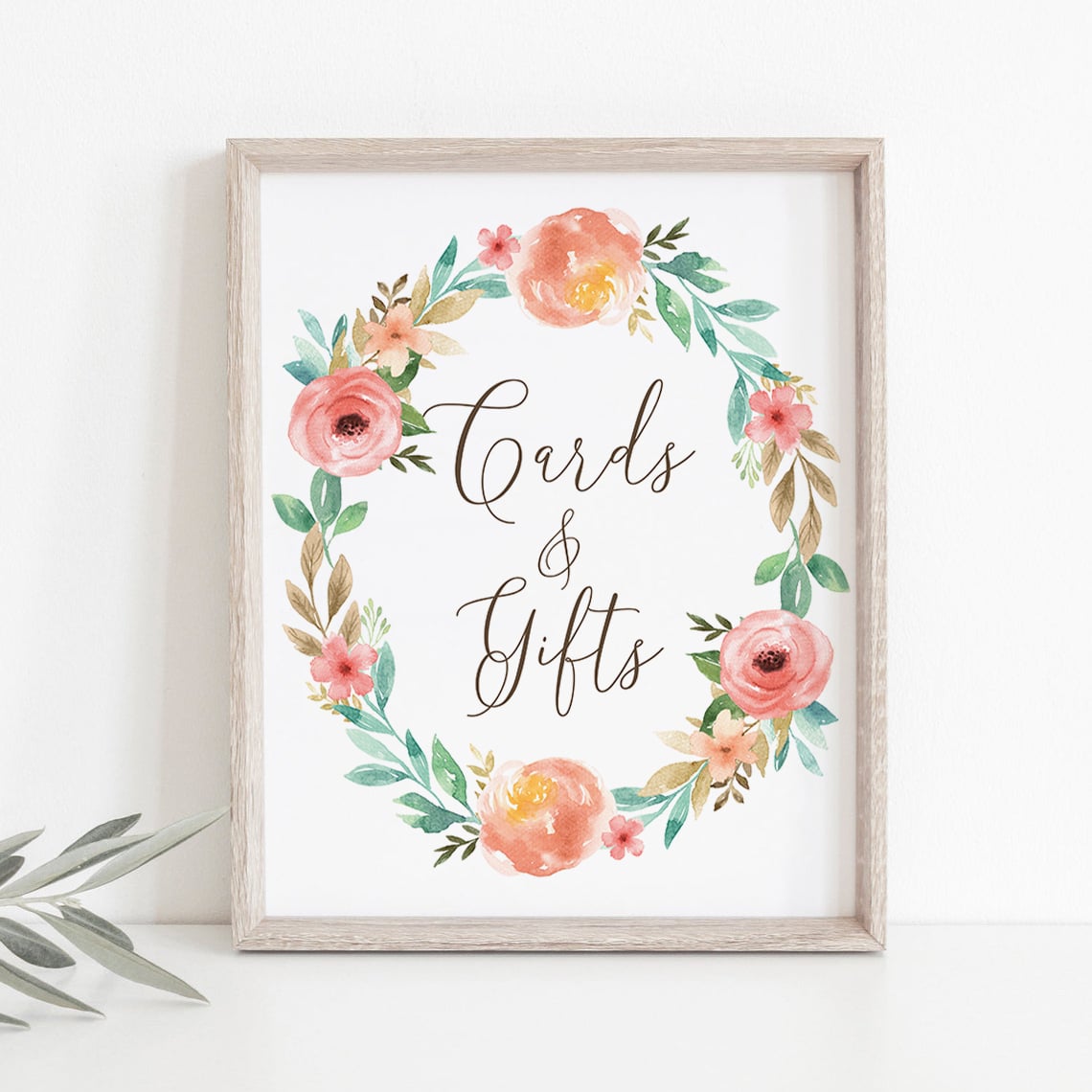 Are you hosting a floral themed party? Let your guests know where to leave their cards and gifts with this gorgeous gift table sign with pink watercolor flowers. This sign would look great on any event where there are gifts.