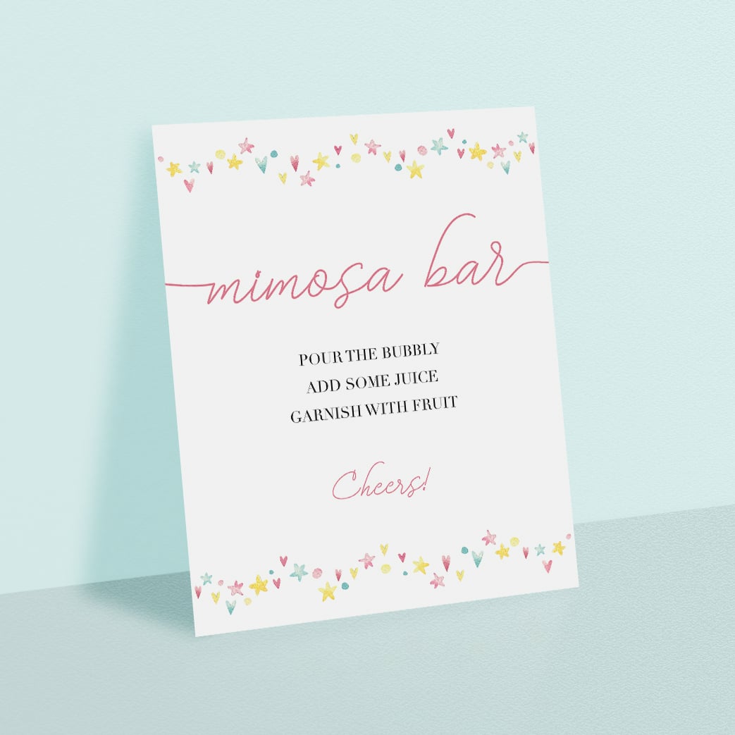 A Mimosa Bar will take your baby shower or bridal shower to the next level. Use this sweet pink and yellow Mimosa Bar sign with watercolor hearts and stars to decorate your Mimosa Bar Table and help guests know how to prepare their drinks. You'll easily add a lovely touch to your pink themed shower.