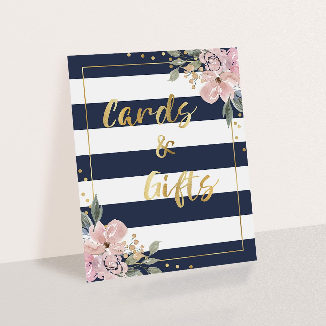 Are you hosting a floral, gold or navy themed party? Let your guests know where to leave their cards and gifts with this chic Cards and Gifts sign with navy stripes and pink florals. This sign would look great on any event where there are gifts.