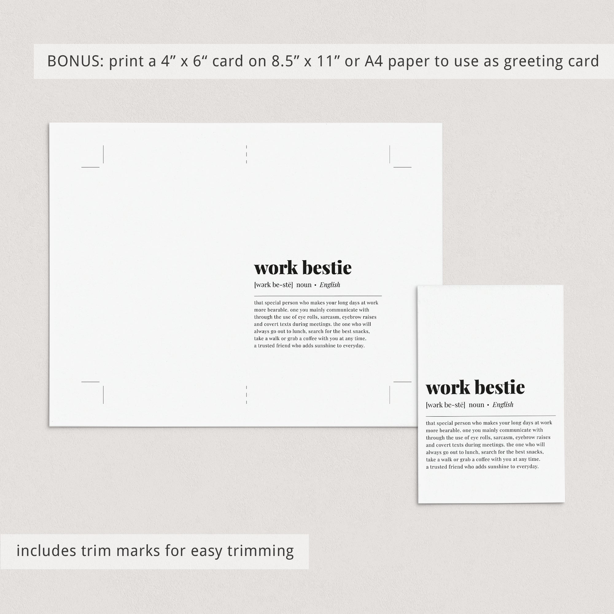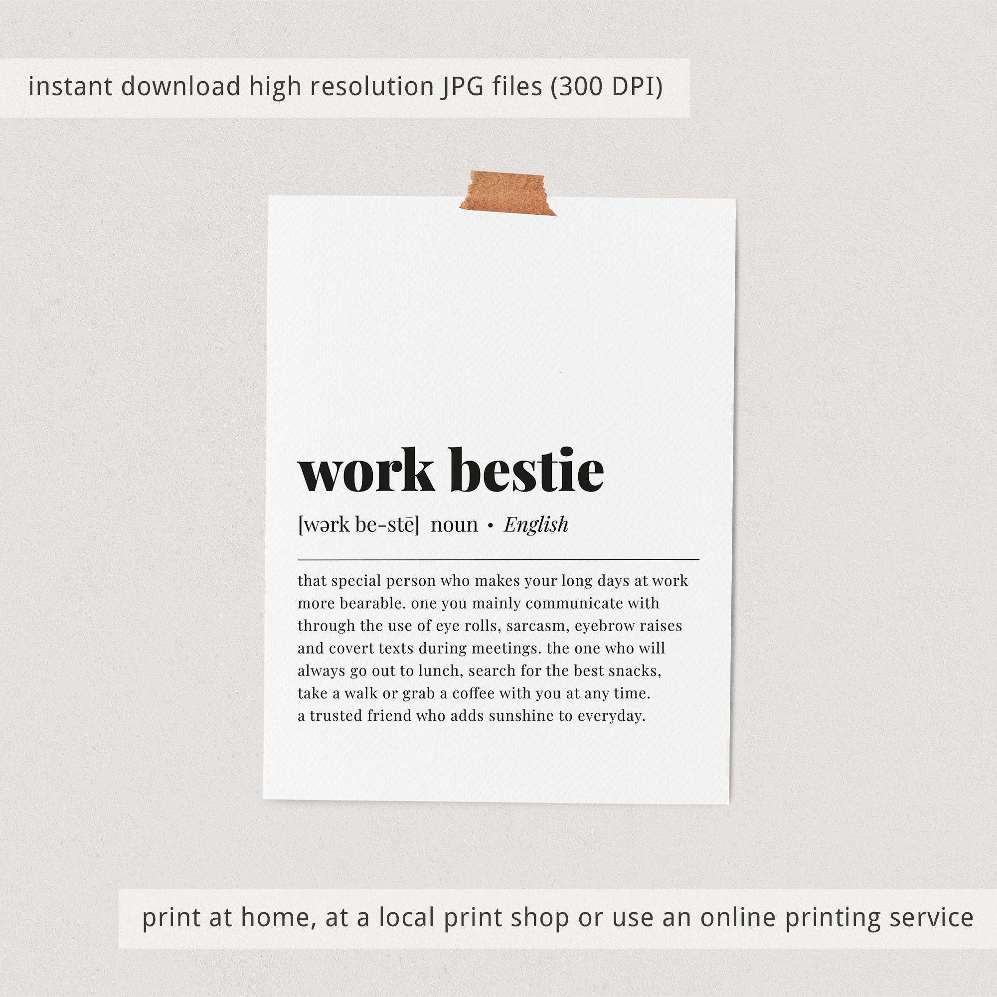 This dictionary-style meaning of the word 'work bestie' print is an instant download. After purchase you will receive a download link immediately on screen. Also within minutes of your order and payment, an e-mail will be sent to you with a link for your download.