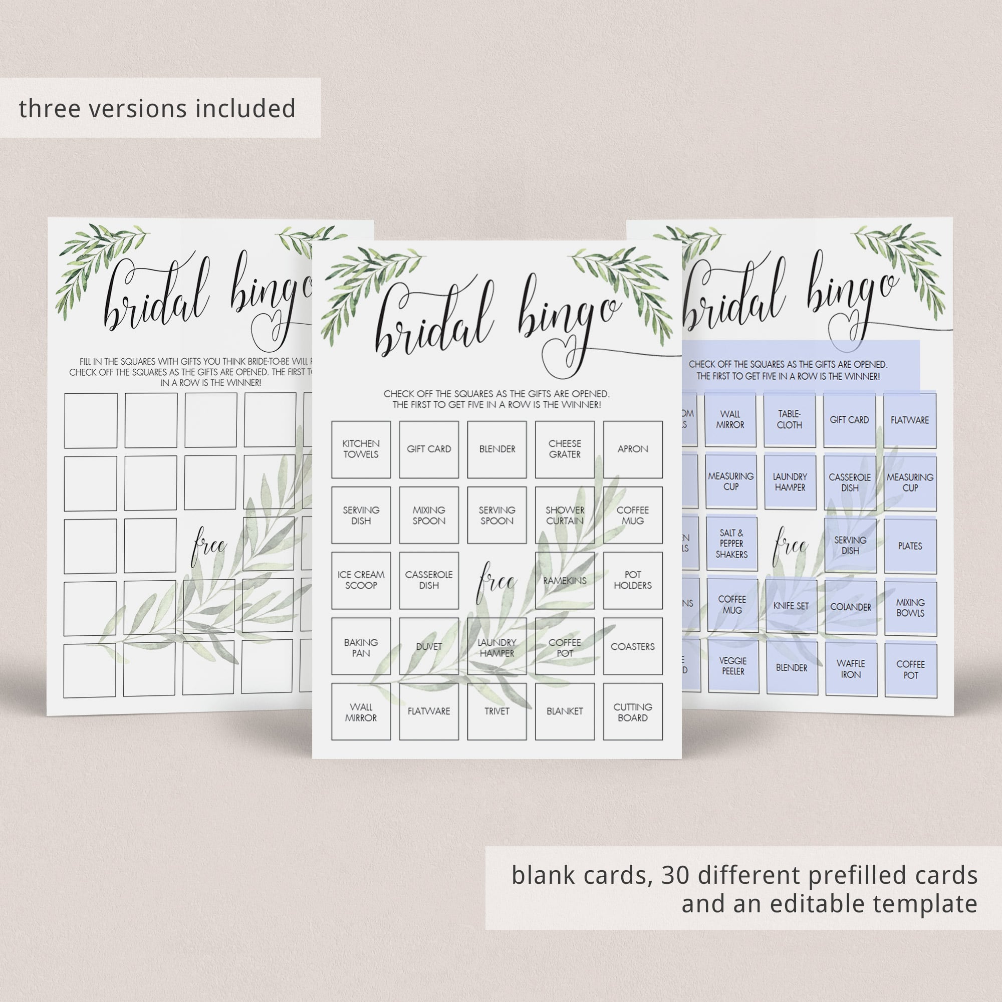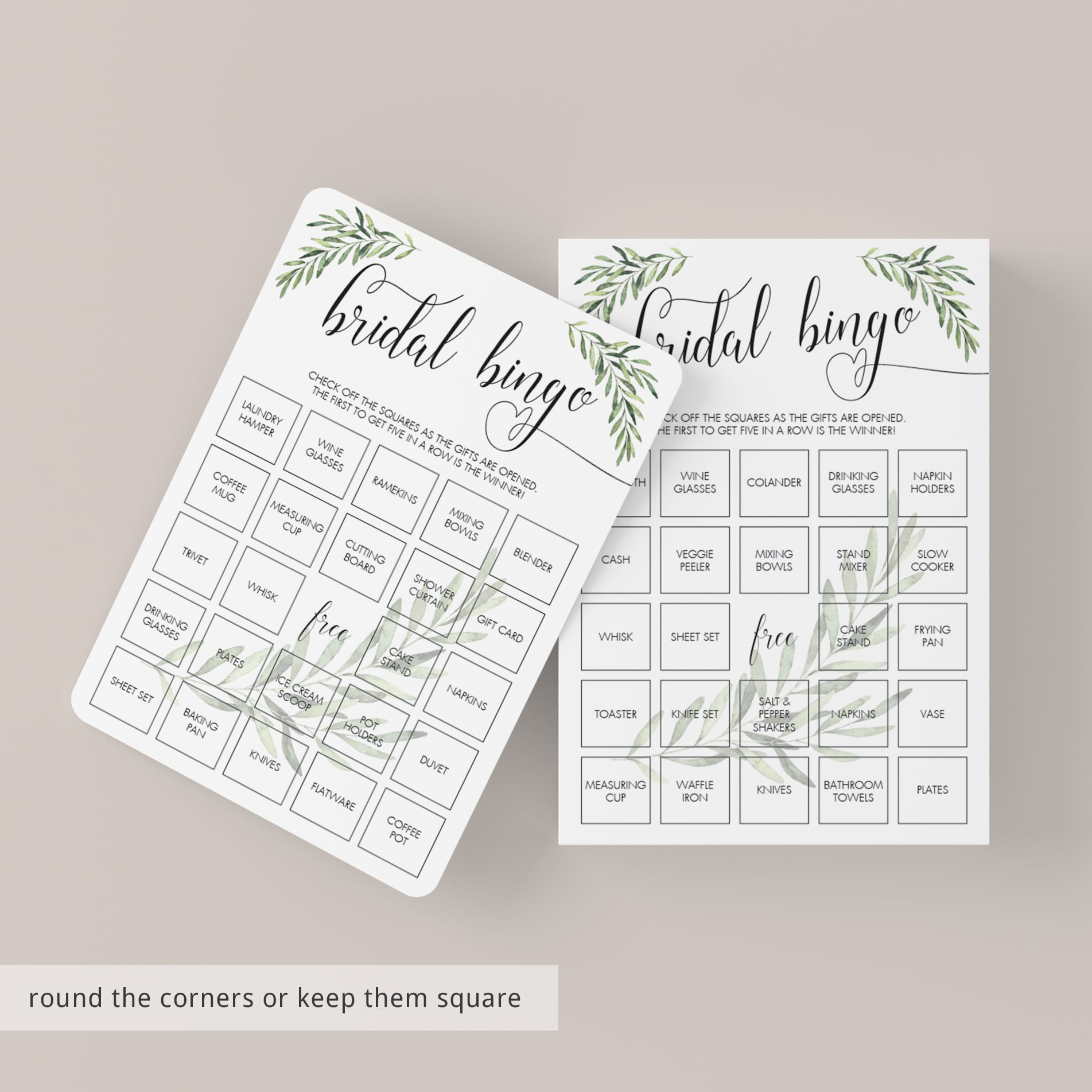 Hand out the greenery bridal bingo game cards to your guests and let them check off the squares as the gifts are being opened by the bride-to-be. The first to get five in a row is the winner!