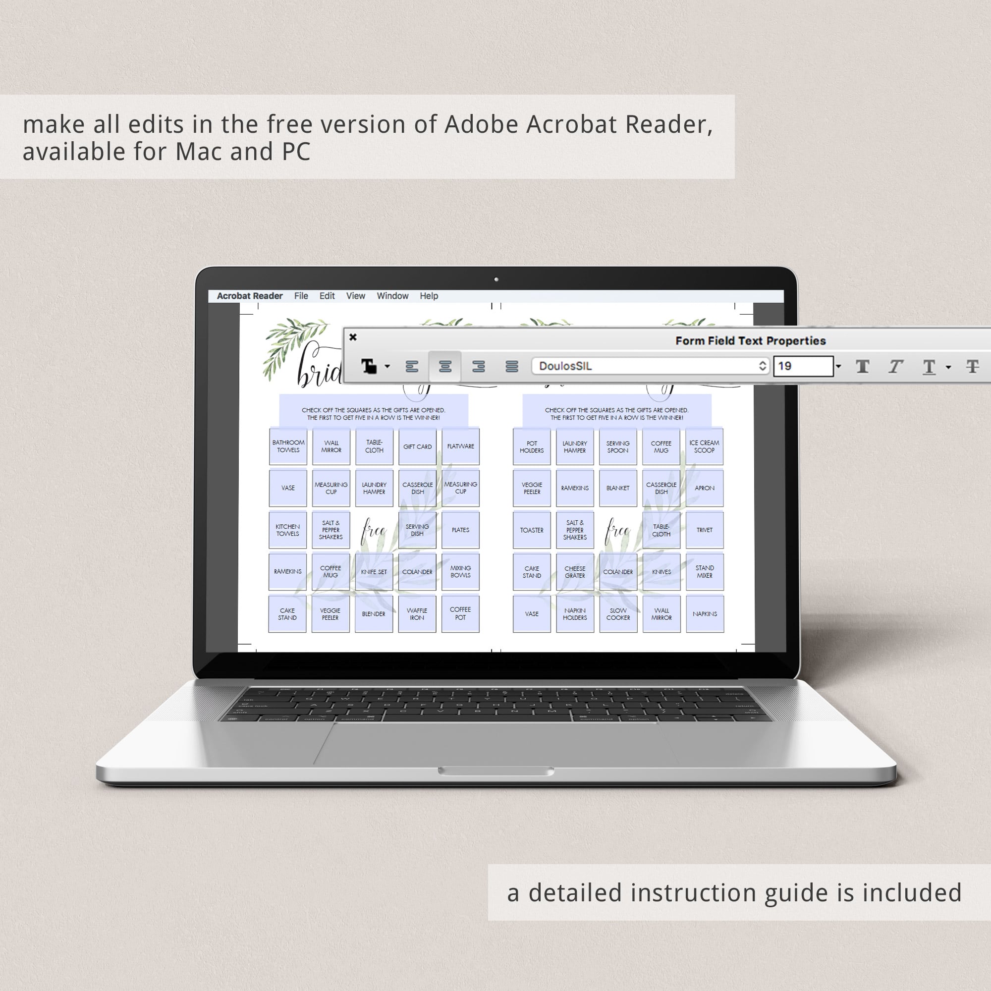 • 1 Editable PDF template sized 8.5” x 11” with trim marks for twice the 5” x 7” design