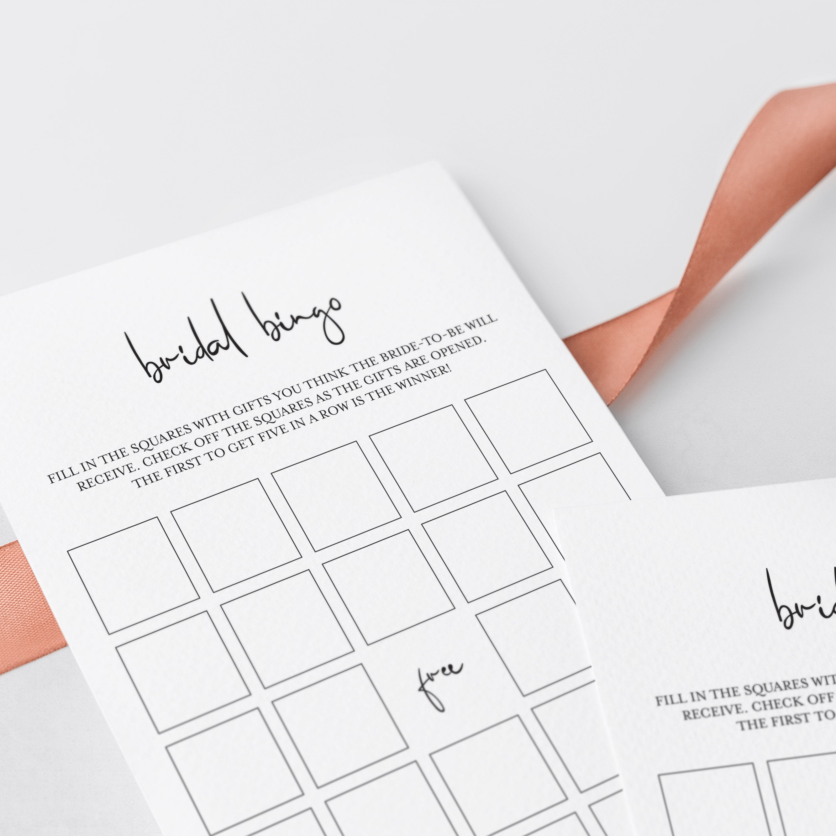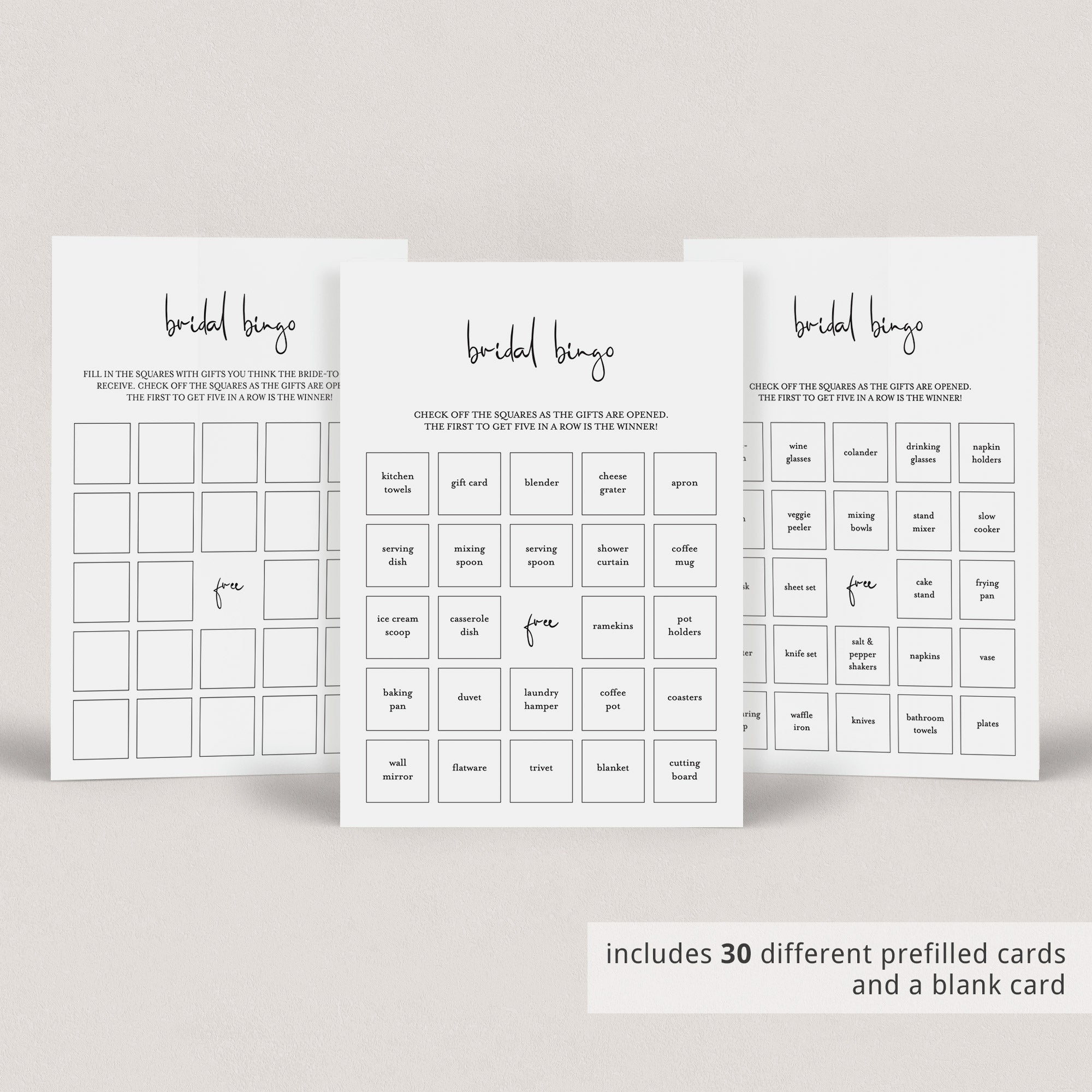 The minimalist bridal bingo game has everything you need to play Bingo in multiple ways. A blank card to be filled in by your guests and 30 different pre filled bingo cards with calling sheet to make things easy.
