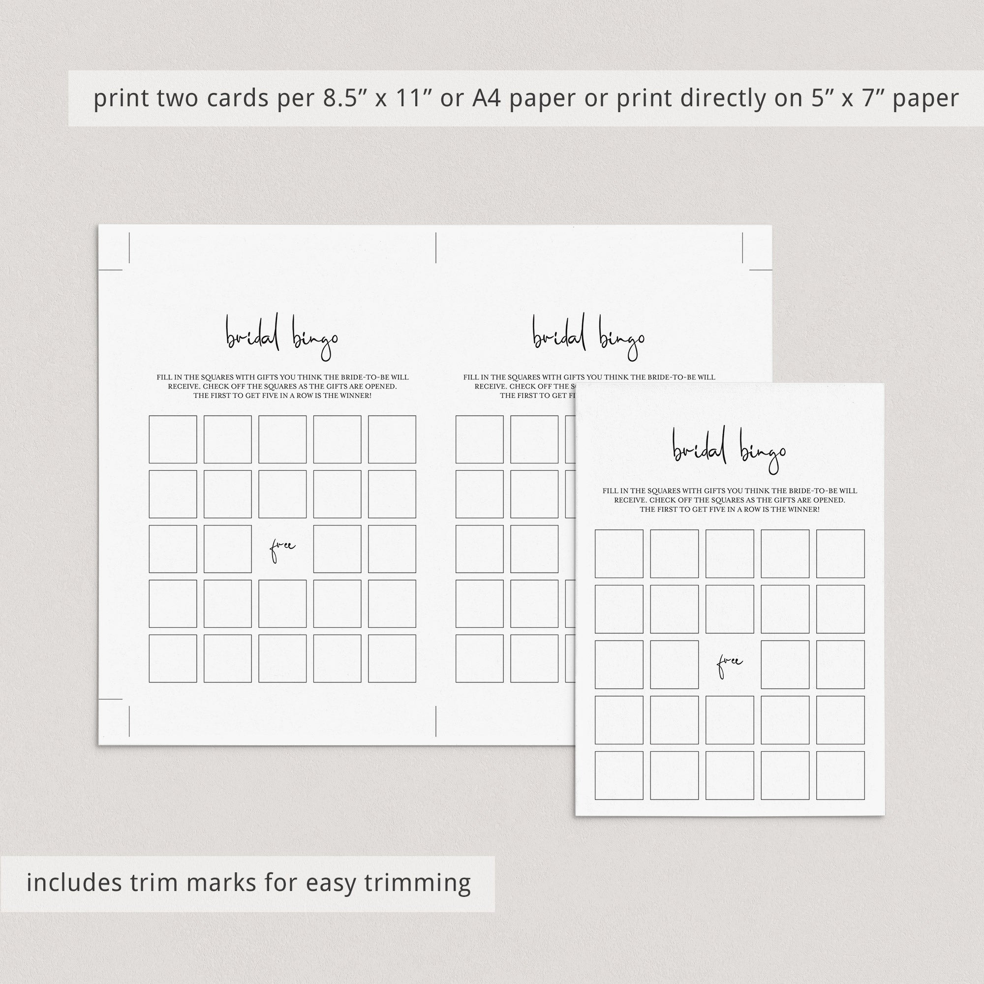 Print the bingo cards right from your computer in a matter of minutes or have them printed at your favorite print shop. The cards have been designed in black and white. You can print on kraft paper to create a rustic look or print on colored card stock to match your party color palette. We recommend printing on a nice heavy card stock for highest quality feel.