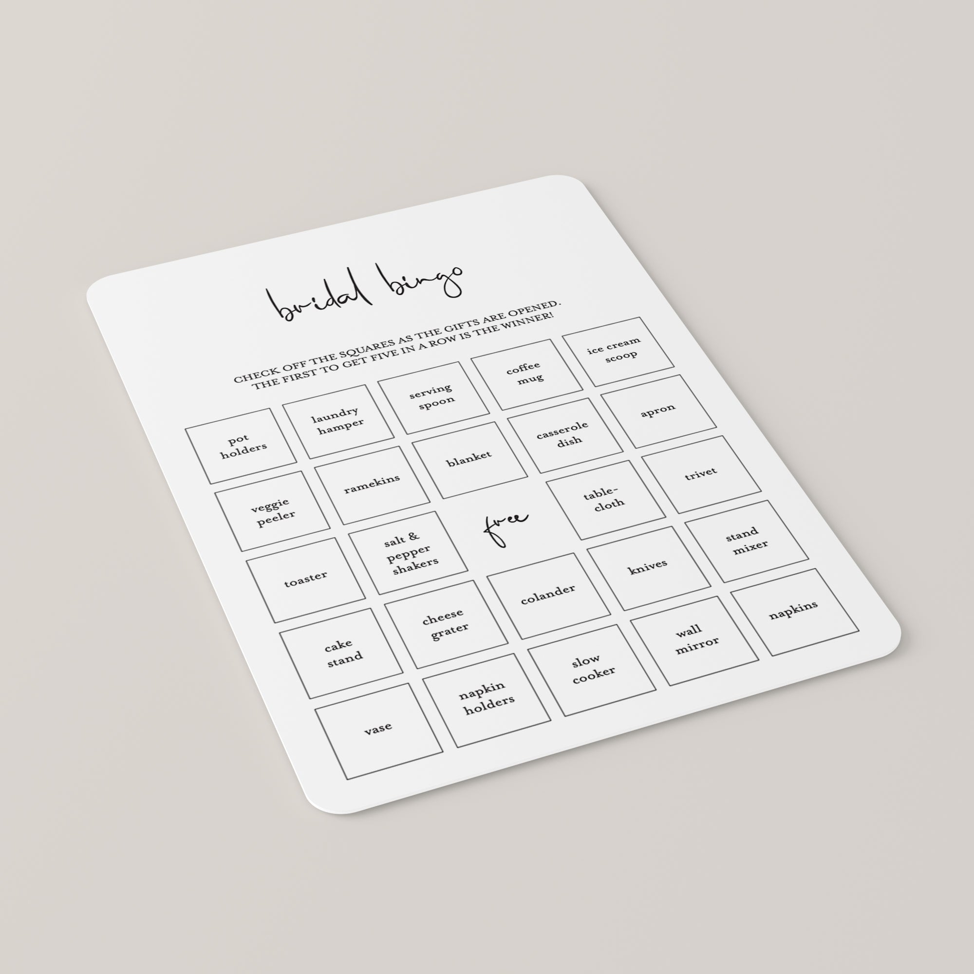 You think that unpacking the bridal shower gifts is the dullest moment of the party? Not with these minimalist bridal bingo cards! They're the perfect addition to your modern wedding shower shower. Check off the squares as the gifts are opened. The first to get five in a row is the winner!