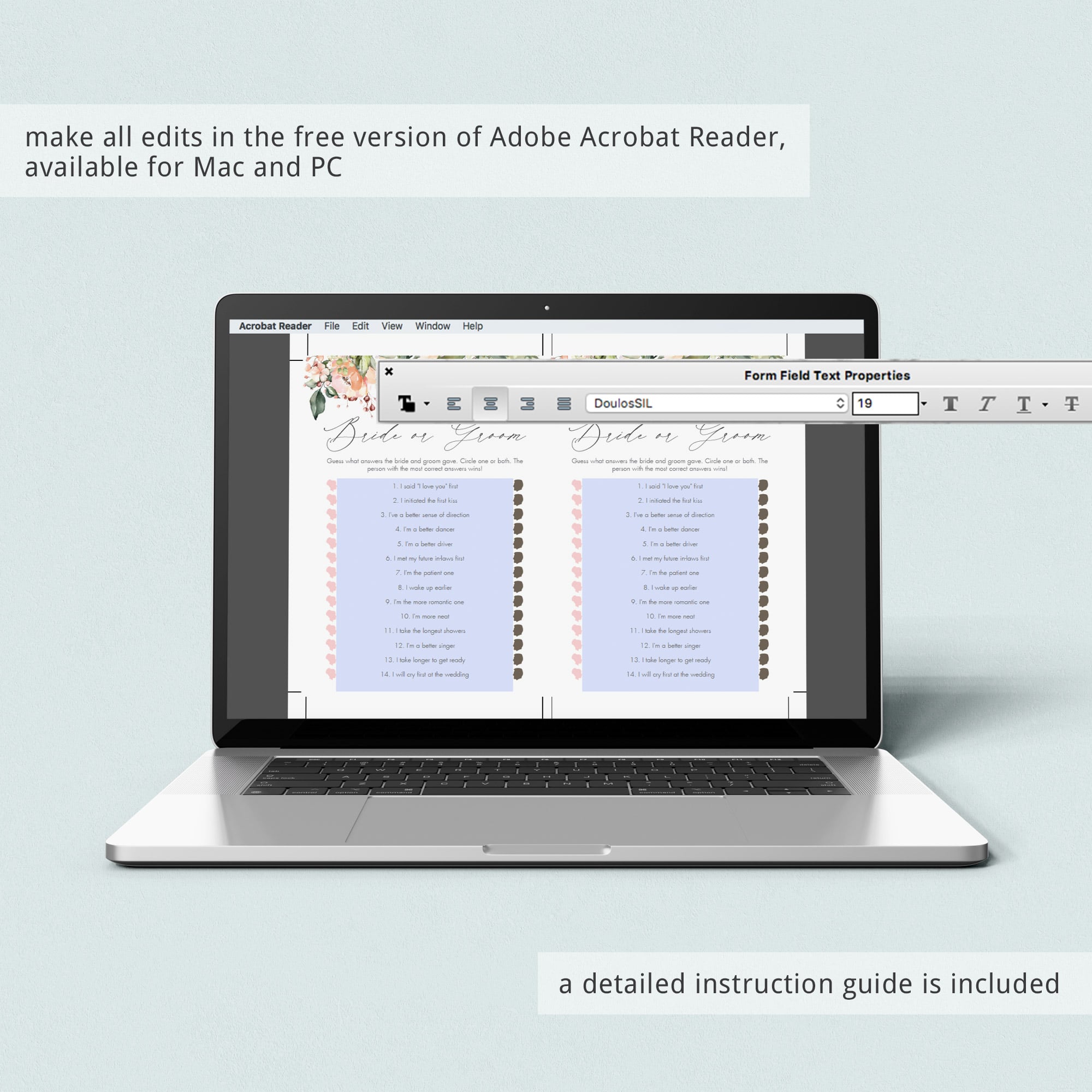 The games Bride or Groom and Mad Libs are editable in the free version of Adobe Acrobat Reader, so that you can personalize the game cards. A detailed instruction guide with tips & tricks on editing, printing, trimming, paper choices and more is included. Print right from your computer in a matter of minutes or have the cards printed at your favorite print shop.